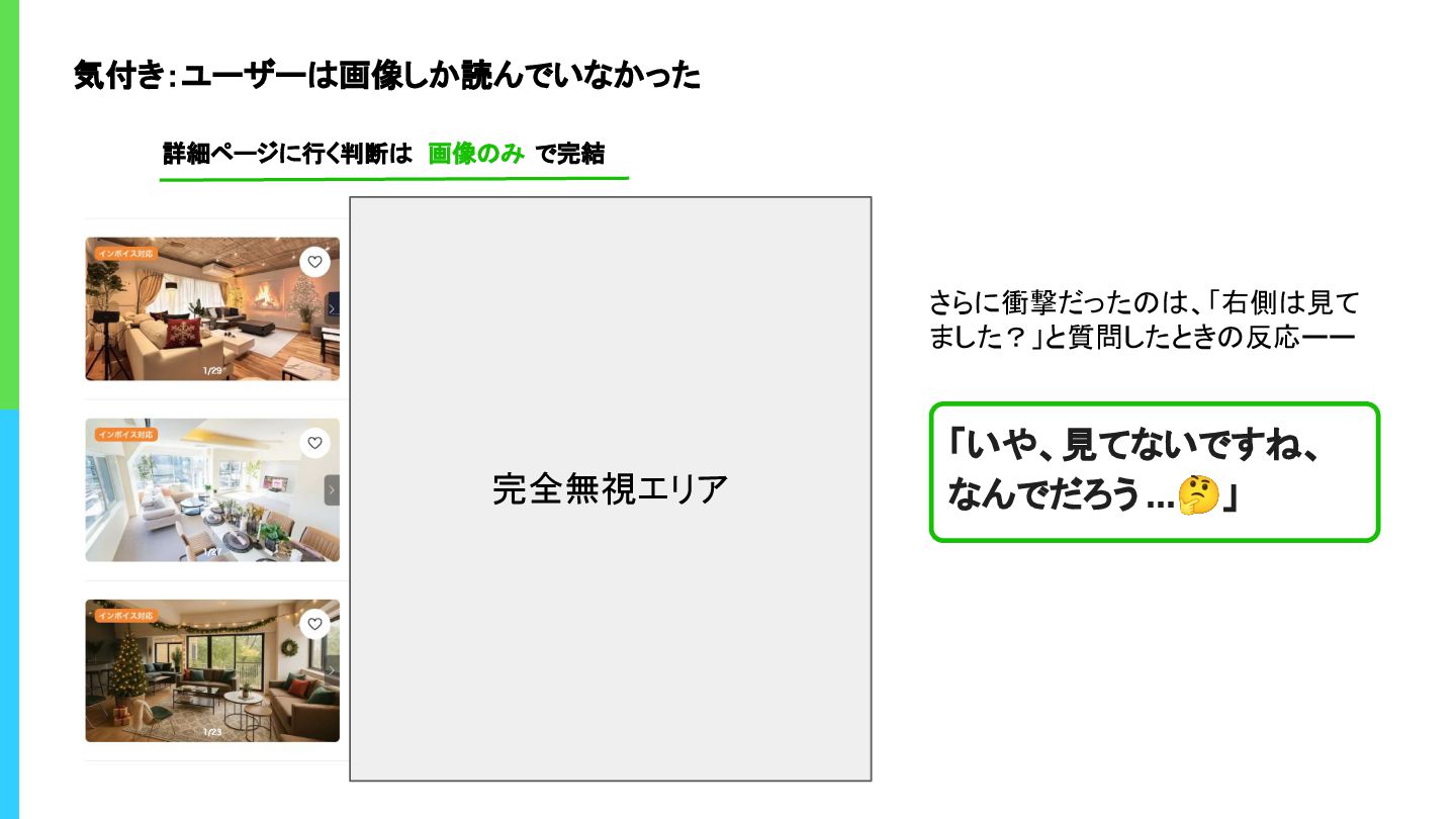 気付き:ユーザーは画像しか読んでいなかった 完全無視エリア 「いや、見てないですね、 なんでだろう ...🤔」 詳細ページに行く判断は 画像のみ で完結 さらに衝撃だったのは、「右側は見て ました?」と質問したときの反応ーー