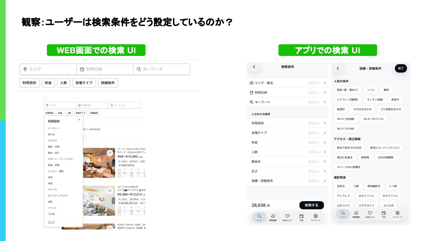 観察:ユーザーは検索条件をどう設定しているのか? WEB画面での検索 UI アプリでの検索 UI