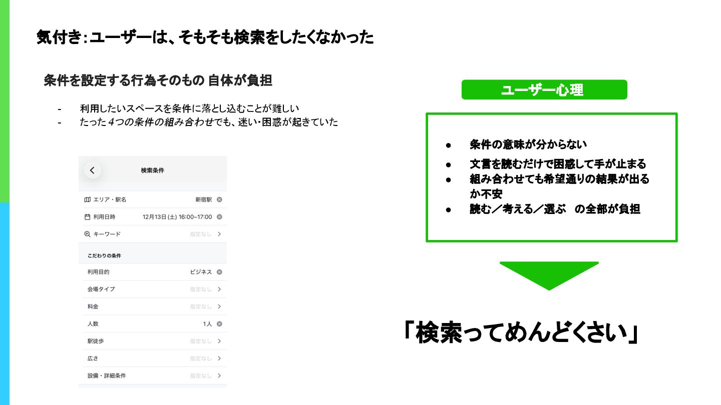 気付き:ユーザーは、そもそも検索をしたくなかった 条件を設定する行為そのもの 自体が負担 - 利用したいスペースを条件に落とし込むことが難しい - たった 4つの条件の組み合わせ でも、迷い・困惑が起きていた •
