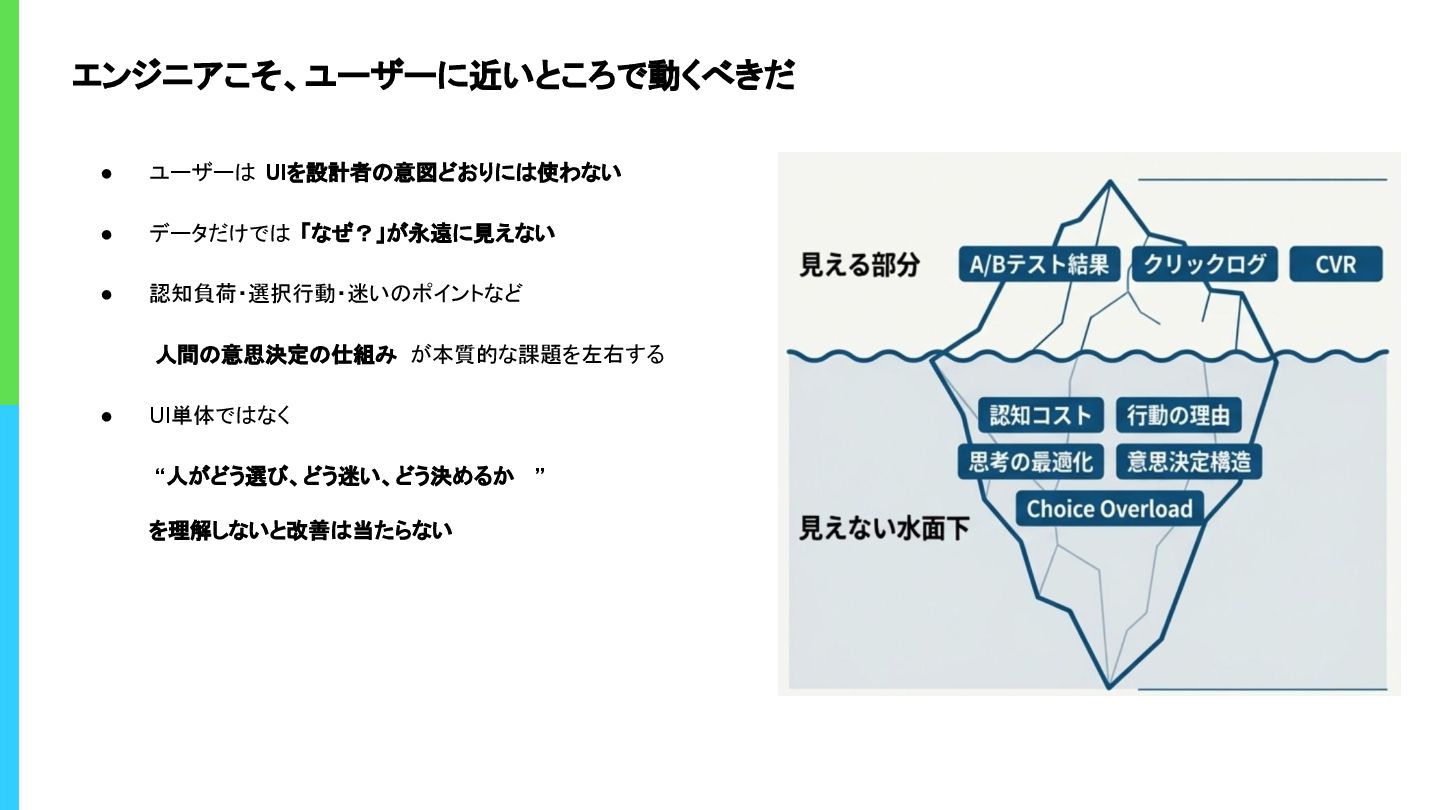 エンジニアこそ、ユーザーに近いところで動くべきだ • ユーザーは UIを設計者の意図どおりには使わない • データだけでは 「なぜ?」が永遠に見えない • 認知負荷・選択行動・迷いのポイントなど 人間の意思決定の仕組み