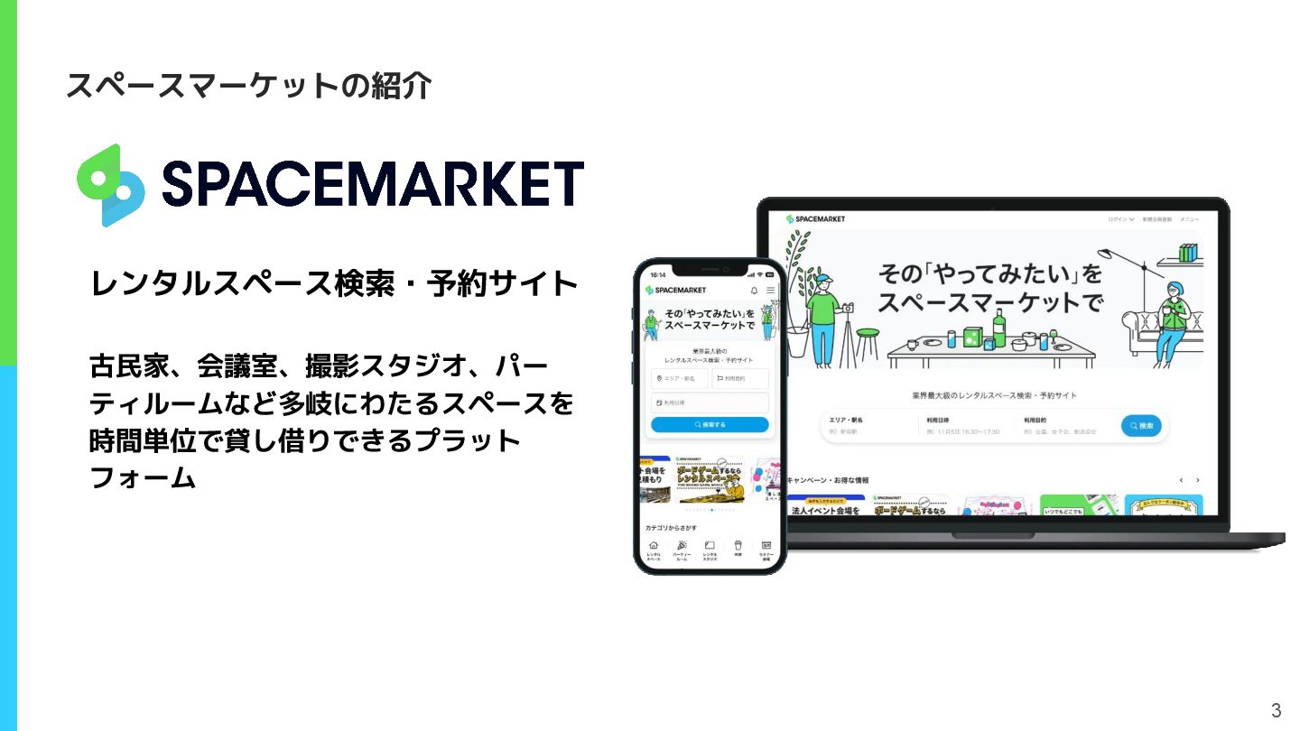 3 スペースマーケットの紹介 レンタルスペース検索・予約サイト 古民家、会議室、撮影スタジオ、パー ティルームなど多岐にわたるスペースを 時間単位で貸し借りできるプラット フォーム