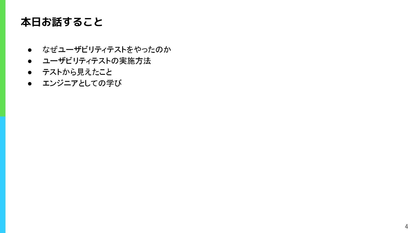 本日お話すること • なぜユーザビリティテストをやったのか • ユーザビリティテストの実施方法 • テストから見えたこと • エンジニアとしての学び 4