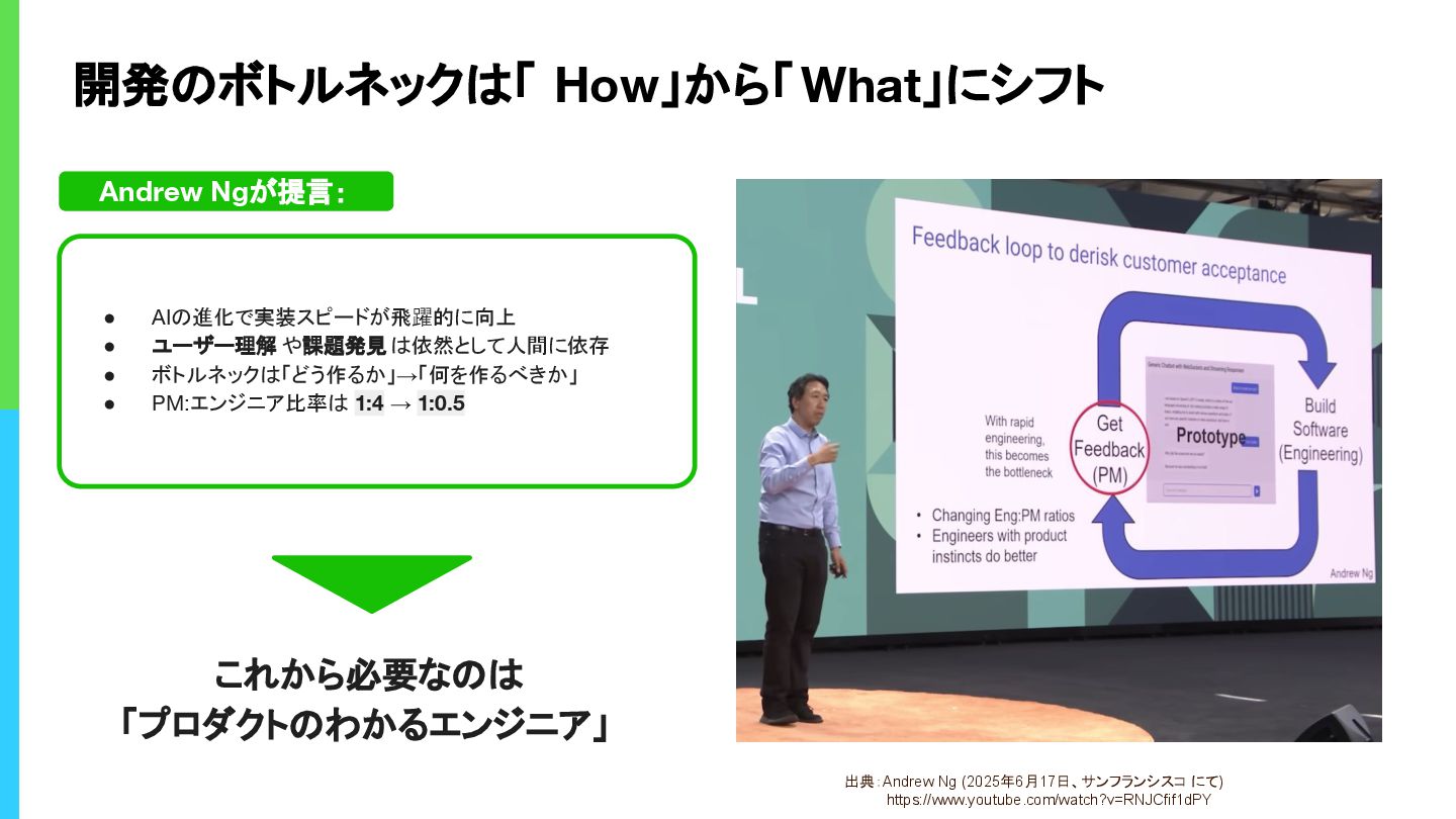 開発のボトルネックは「 How」から「What」にシフト 出典:Andrew Ng (2025年6月17日、サンフランシスコ にて) https://www.youtube.com/watch?v=RNJCfif1dPY Andrew Ngが提言: •