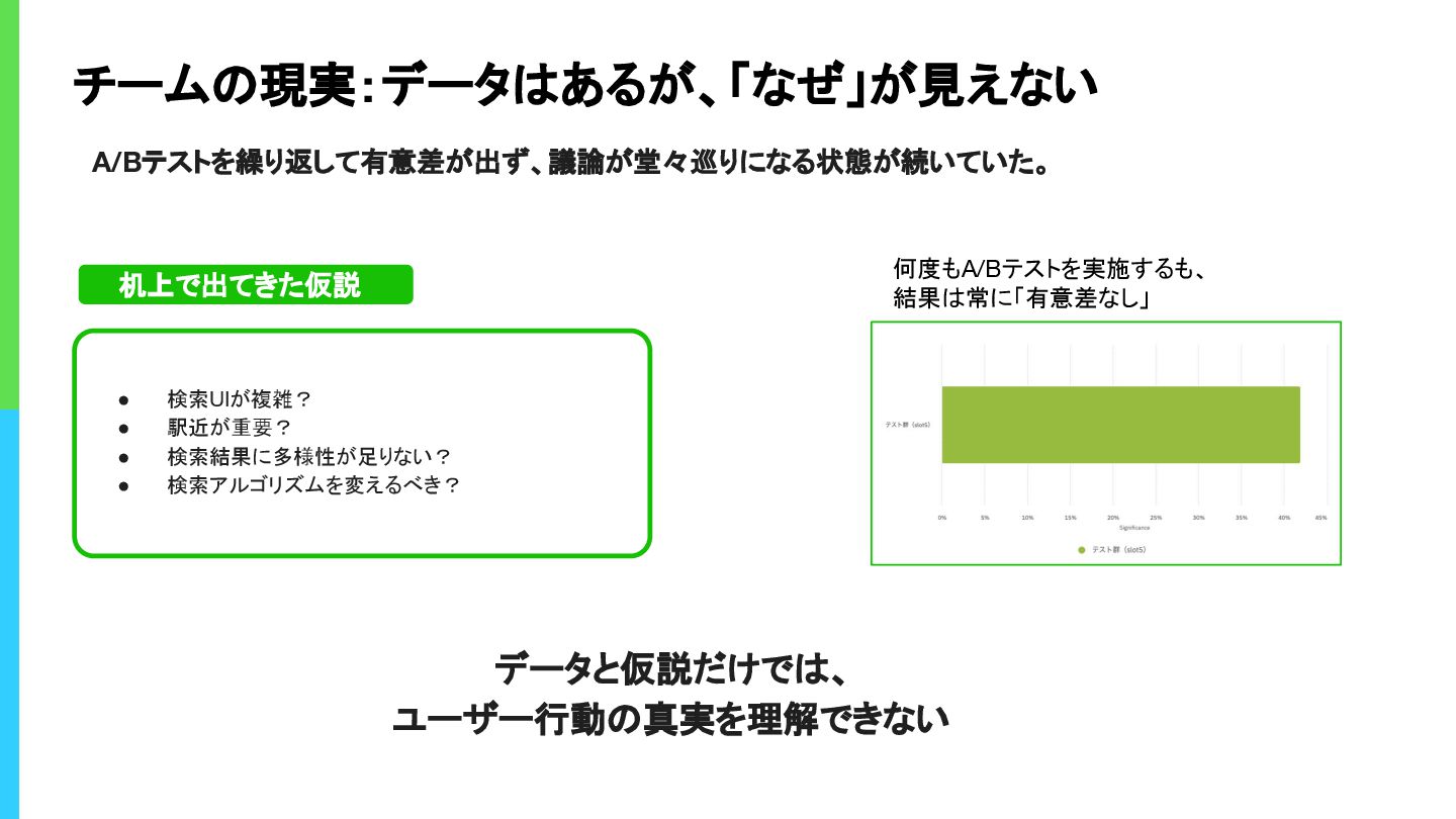 チームの現実:データはあるが、「なぜ」が見えない A/Bテストを繰り返して有意差が出ず、議論が堂々巡りになる状態が続いていた。 机上で出てきた仮説 何度もA/Bテストを実施するも、 結果は常に「有意差なし」 • 検索UIが複雑? • 駅近が重要? •