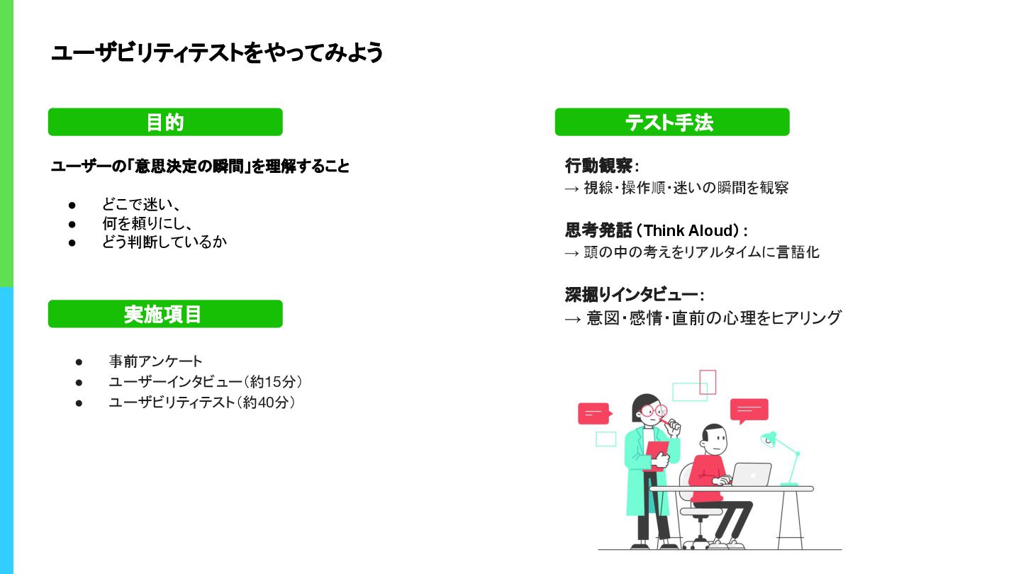 行動観察: → 視線・操作順・迷いの瞬間を観察 思考発話(Think Aloud): → 頭の中の考えをリアルタイムに言語化 深掘りインタビュー: → 意図・感情・直前の心理をヒアリング ユーザーの「意思決定の瞬間」を理解すること • どこで迷い、 • 何を頼りにし、 • どう判断しているか