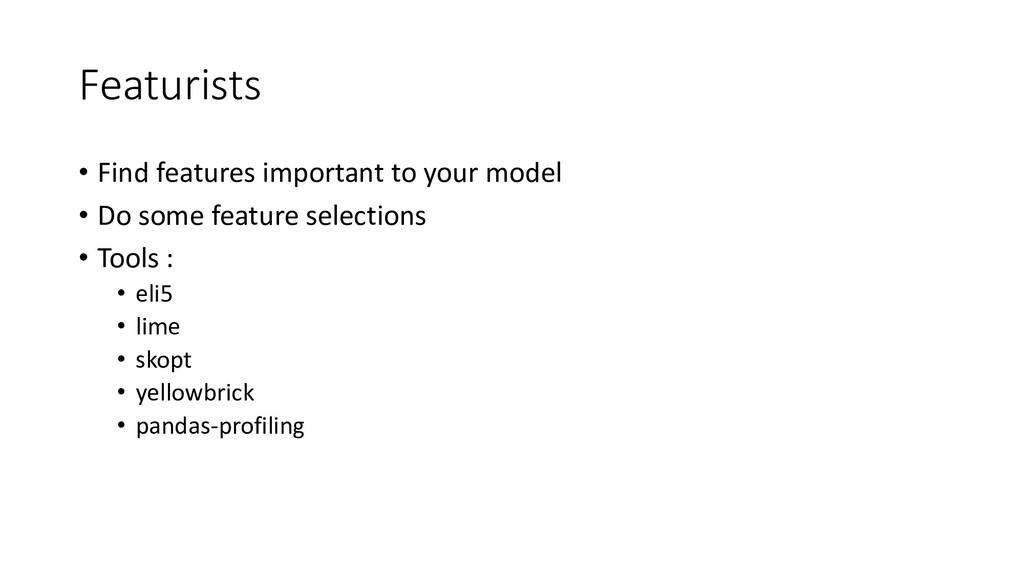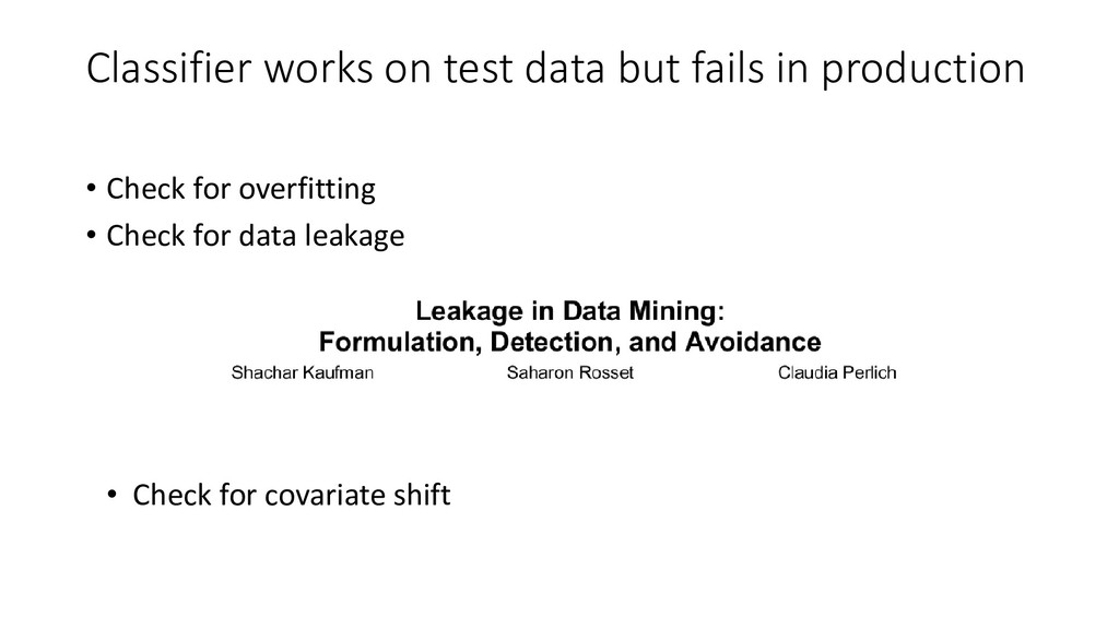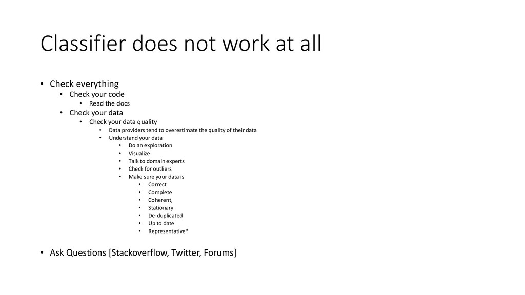 Check your code • Read the docs • Check your data • Check your data quality • Data providers tend to overestimate the quality of their data • Understand your data • Do an exploration • Visualize • Talk to domain experts • Check for outliers • Make sure your data is • Correct • Complete • Coherent, • Stationary • De-duplicated • Up to date • Representative* • Ask Questions [Stackoverflow, Twitter, Forums]