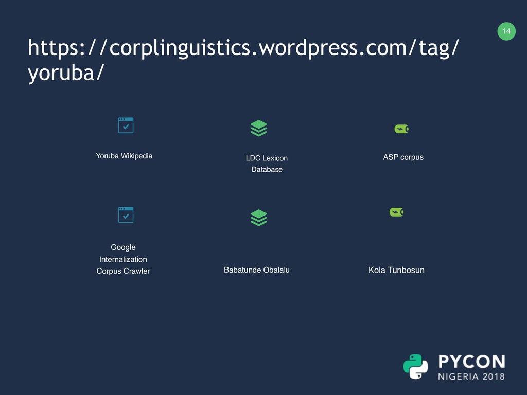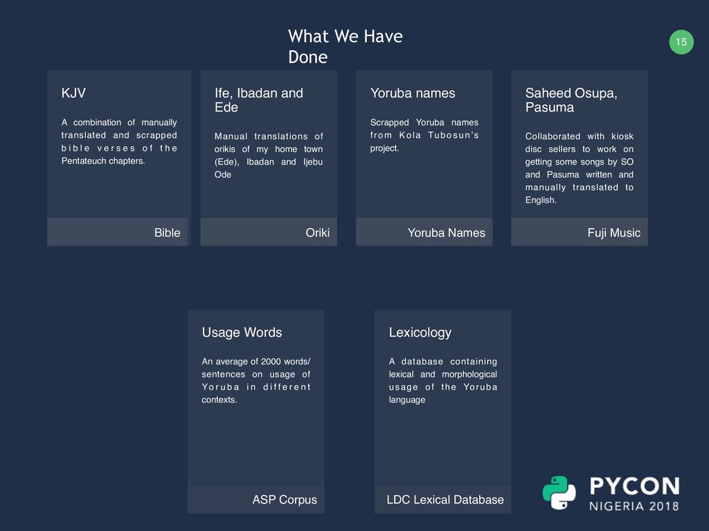 usage of Yo r u b a i n d i f f e r e n t contexts. Ife, Ibadan and Ede Manual translations of orikis of my home town (Ede), Ibadan and Ijebu Ode Yoruba names Scrapped Yoruba names from Kola Tubosun’s project. Saheed Osupa, Pasuma Collaborated with kiosk disc sellers to work on getting some songs by SO and Pasuma written and manually translated to English. Bible Oriki Yoruba Names Fuji Music KJV A combination of manually translated and scrapped b i b l e v e r s e s o f t h e Pentateuch chapters. ASP Corpus Lexicology A database containing lexical and morphological usage of the Yoruba language LDC Lexical Database What We Have Done