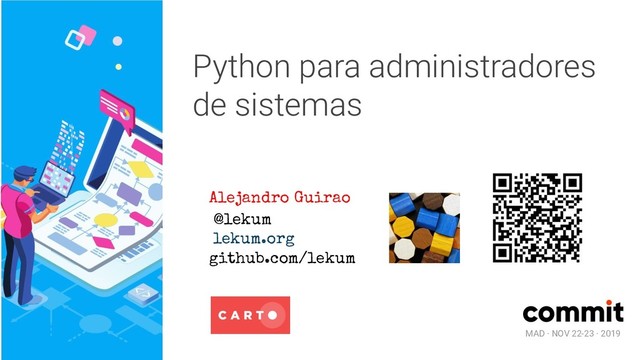 En esta charla explicaré, poniéndonos por un rato en la piel de una administradora de sistemas, cómo usar Python para crear herramientas de línea de comandos para automatizar acciones repetitivas y resolver diversos problemas. A lo largo de la charla introduciré varios poderosos módulos tanto de la biblioteca estándar como de terceros que nos ayudarán a la hora de crear nuestras utilidades. ¡Dile adiós a BASH!