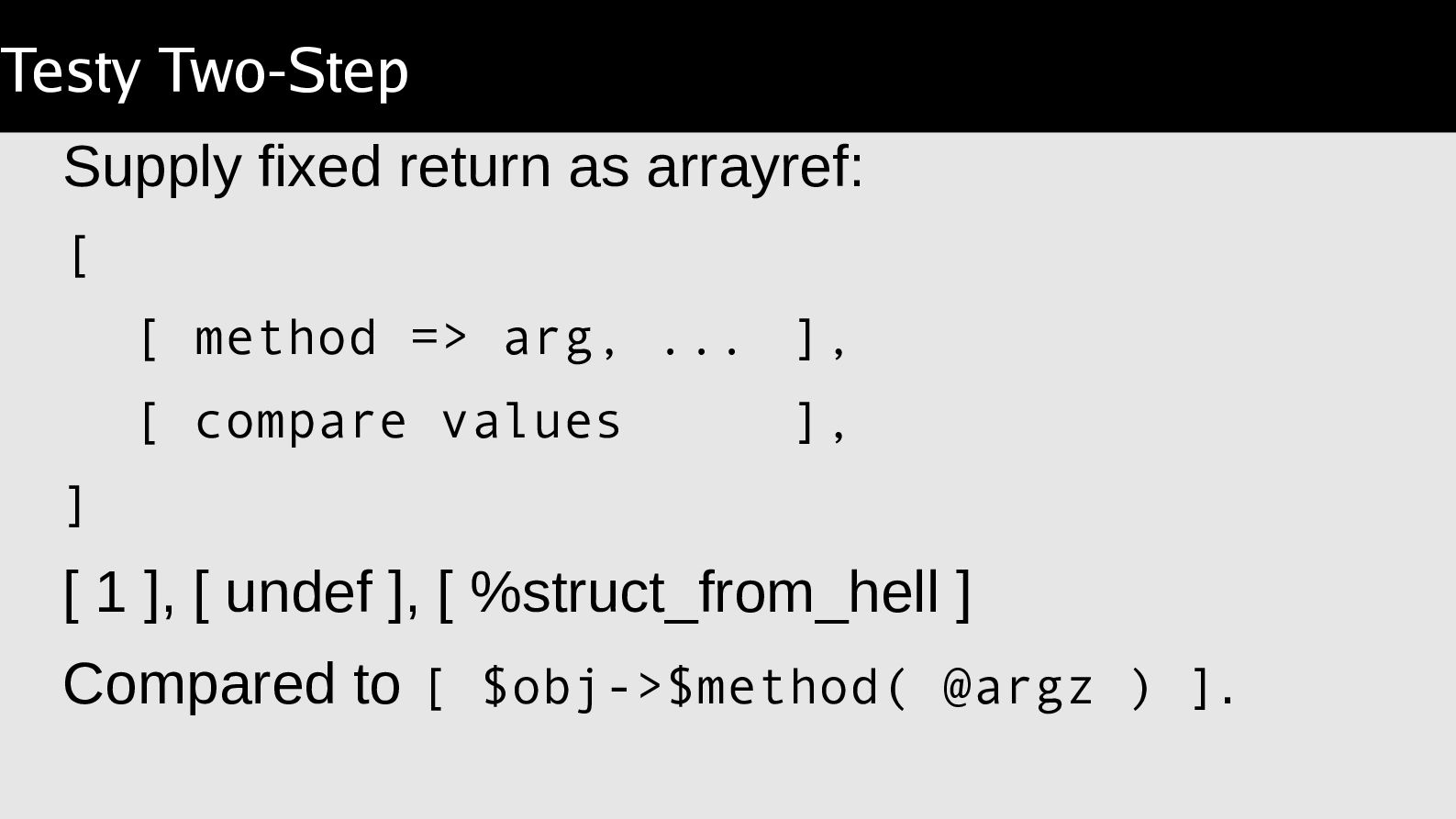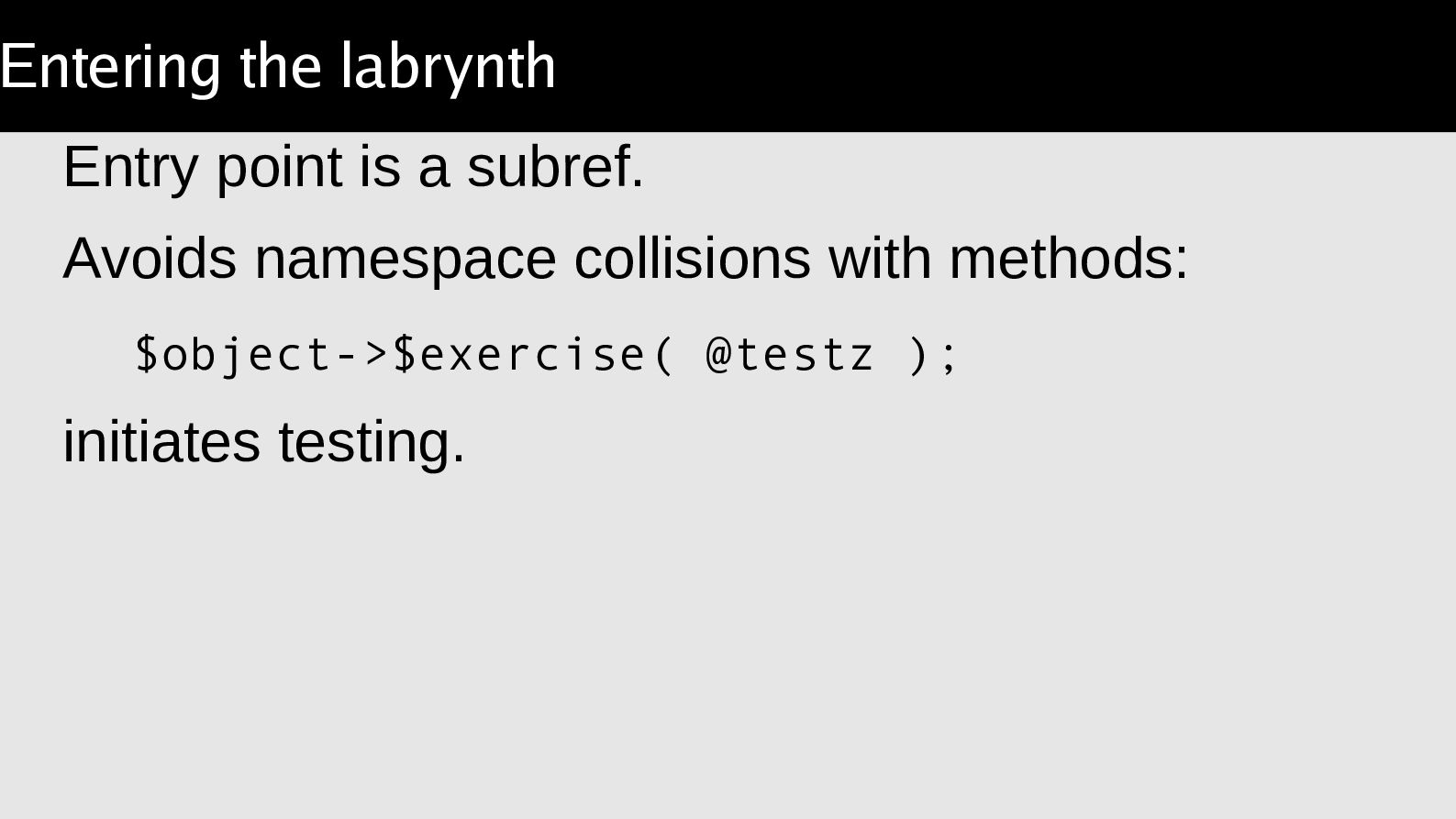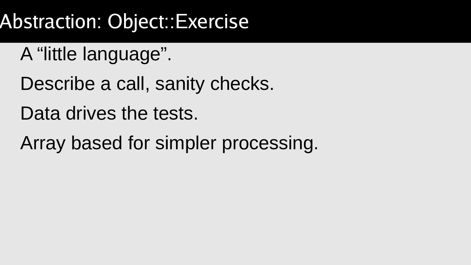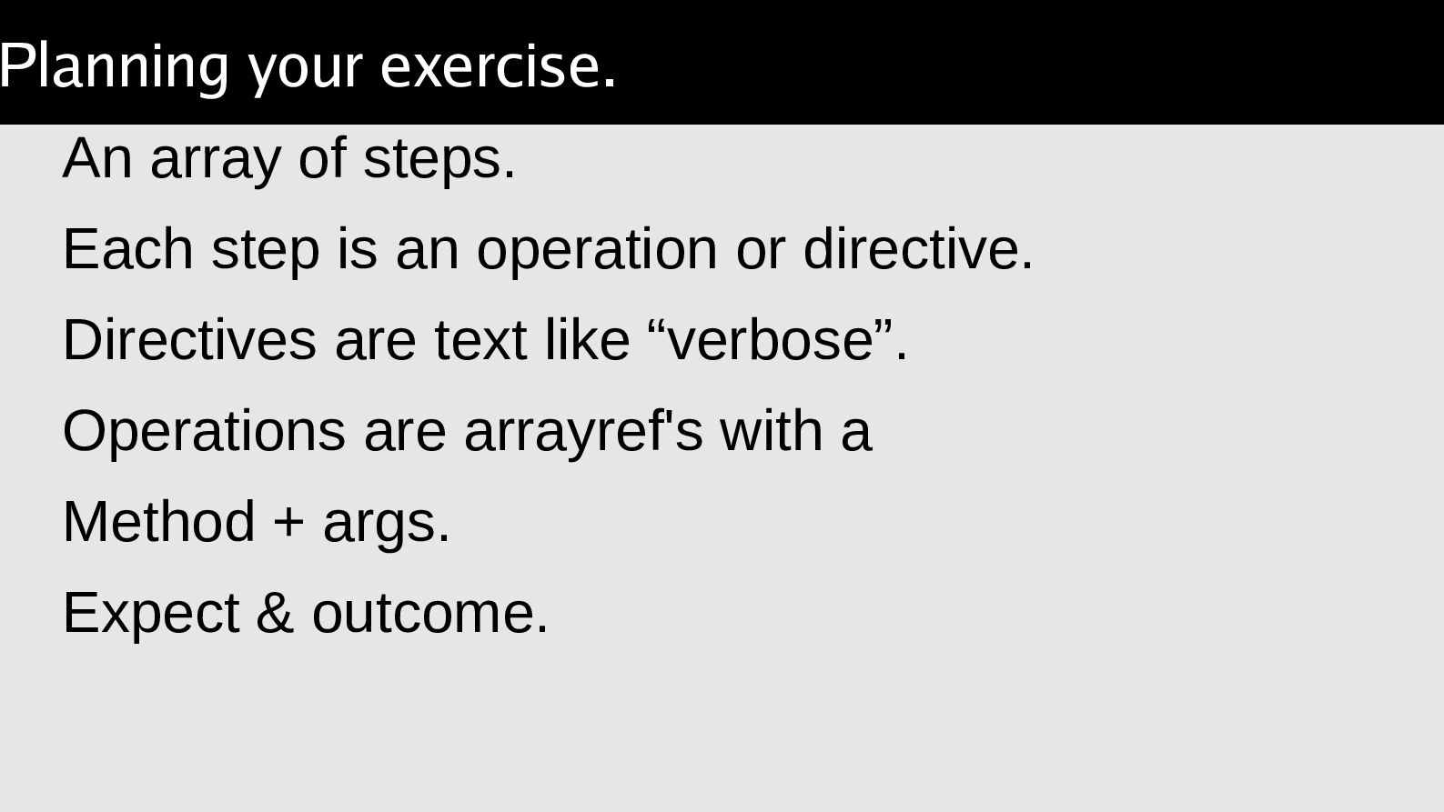 arguments, compare a result. Object::Excercise takes the lather,