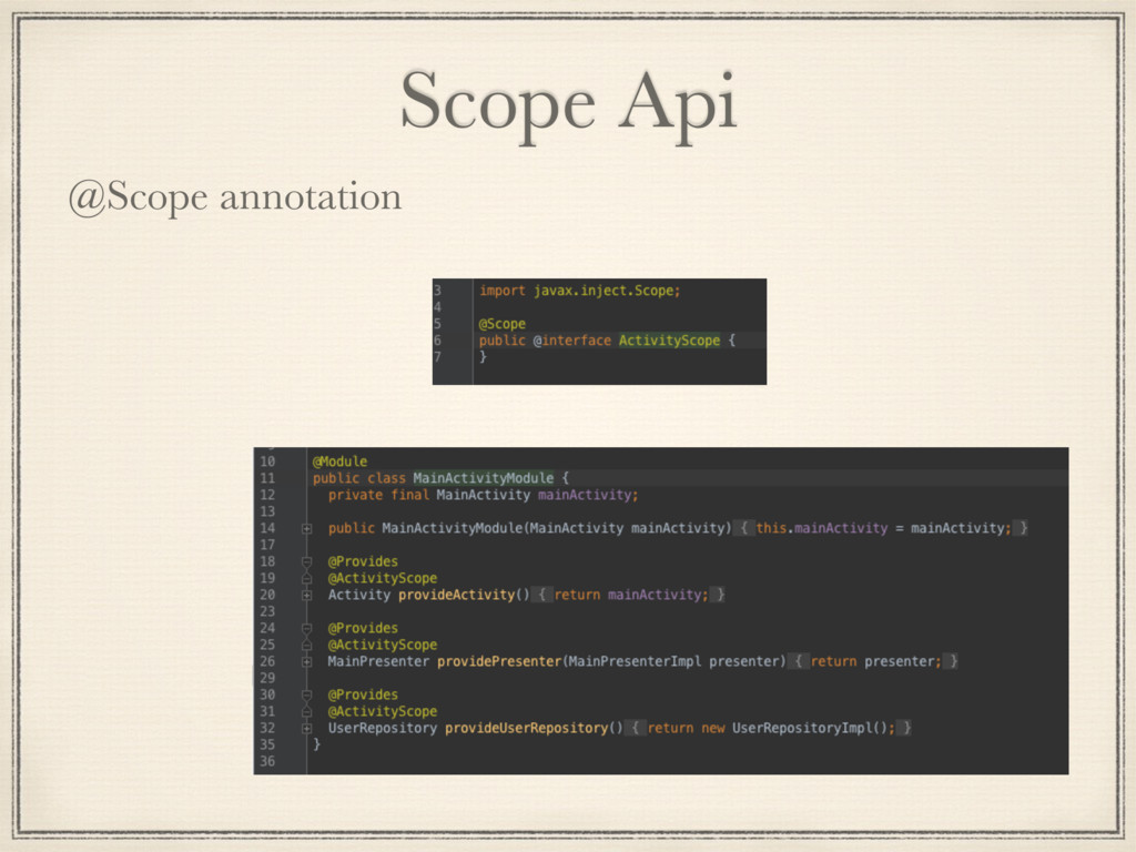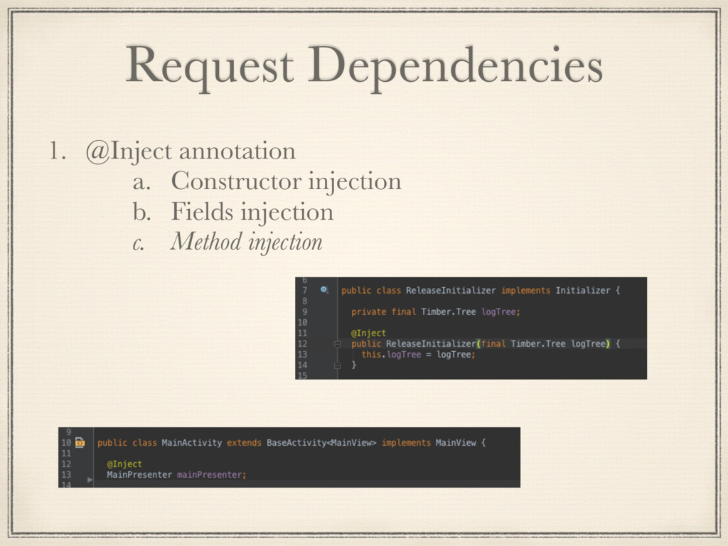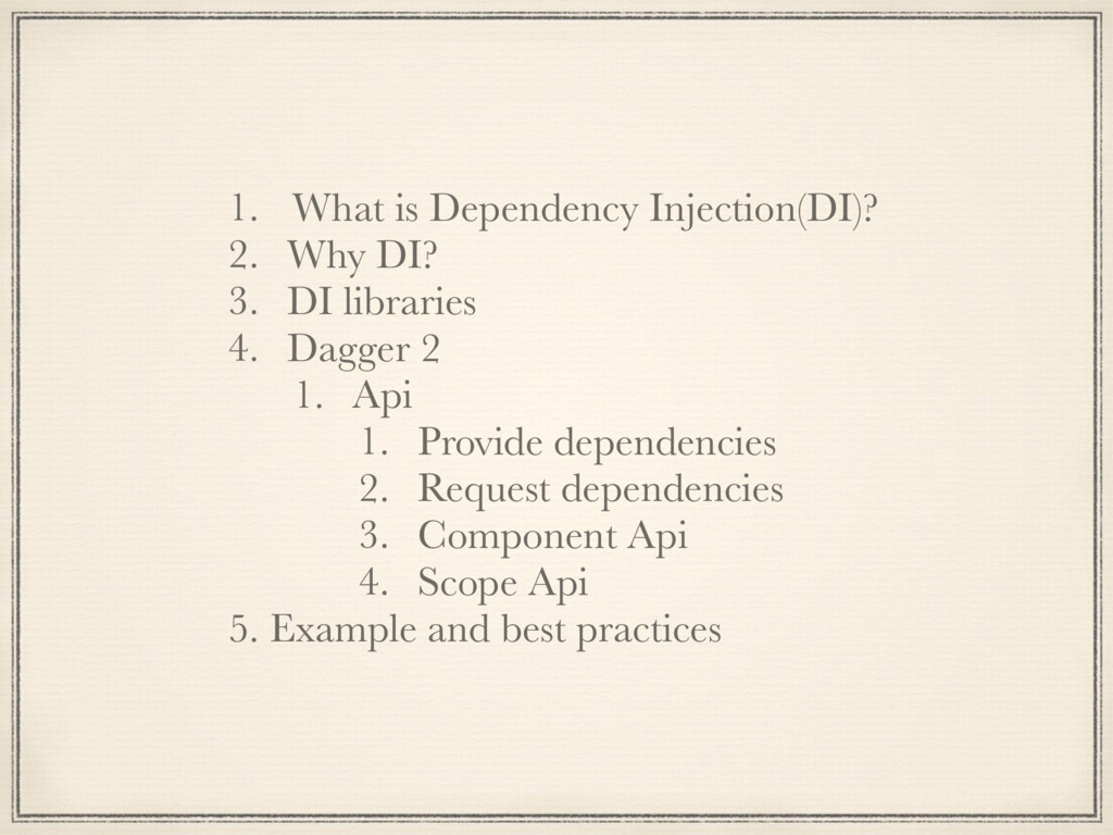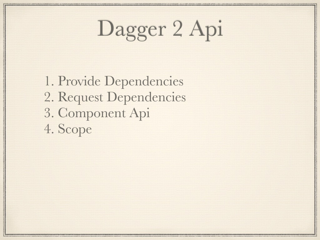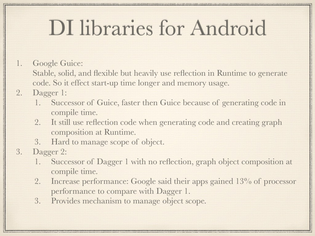 and flexible but heavily use reflection in Runtime to generate code. So it effect start-up time longer and memory usage. 2. Dagger 1: 1. Successor of Guice, faster then Guice because of generating code in compile time. 2. It still use reflection code when generating code and creating graph composition at Runtime. 3. Hard to manage scope of object. 3. Dagger 2: 1. Successor of Dagger 1 with no reflection, graph object composition at compile time. 2. Increase performance: Google said their apps gained 13% of processor performance to compare with Dagger 1. 3. Provides mechanism to manage object scope.