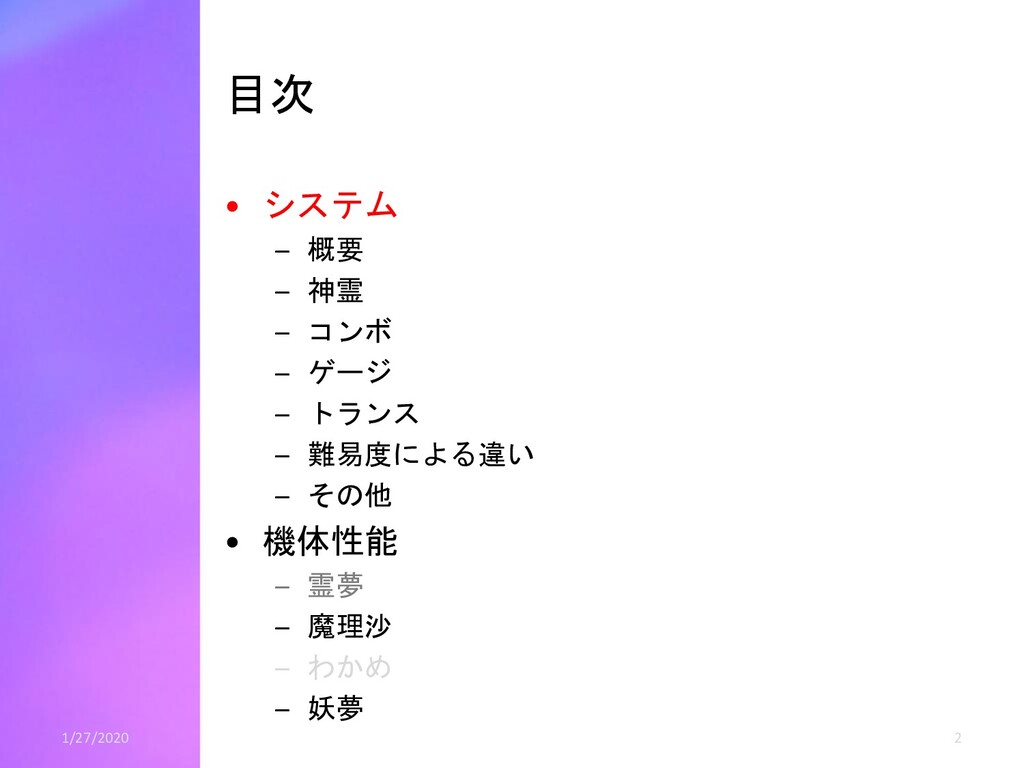 ゲージ – トランス – 難易度による違い – その他 • 機体性能 – 霊夢 – 魔理沙 – わかめ – 妖夢 1/27/2020 2