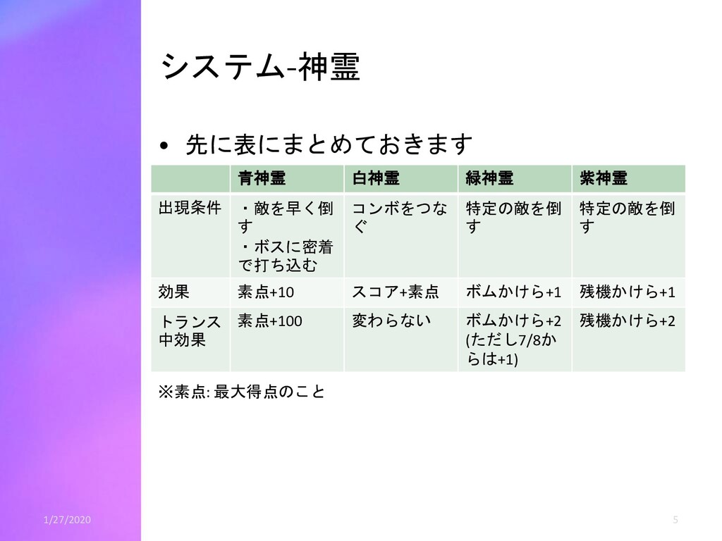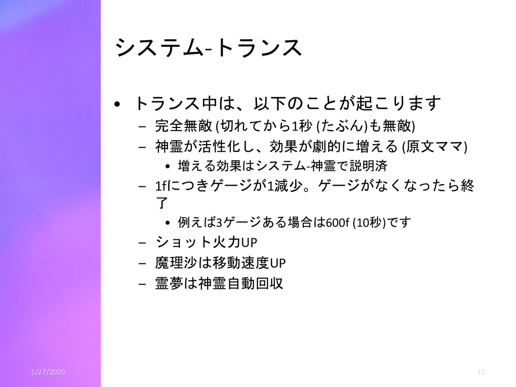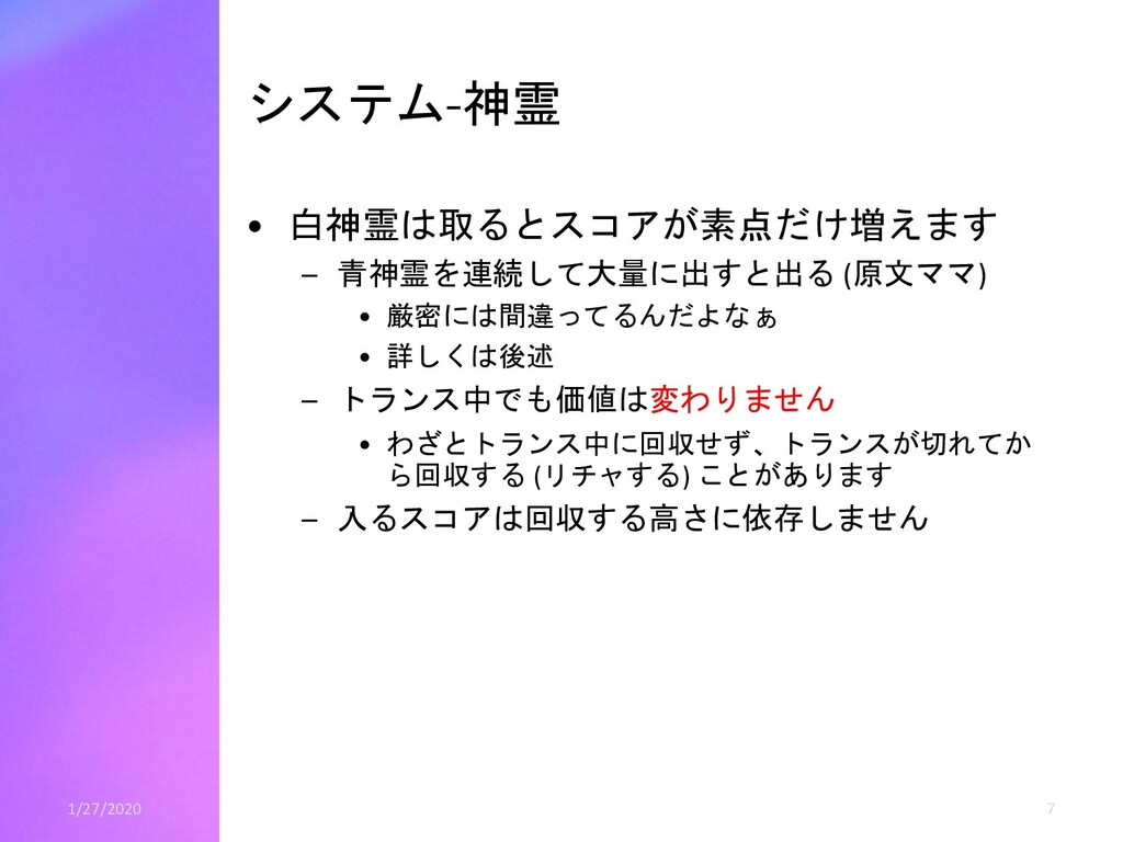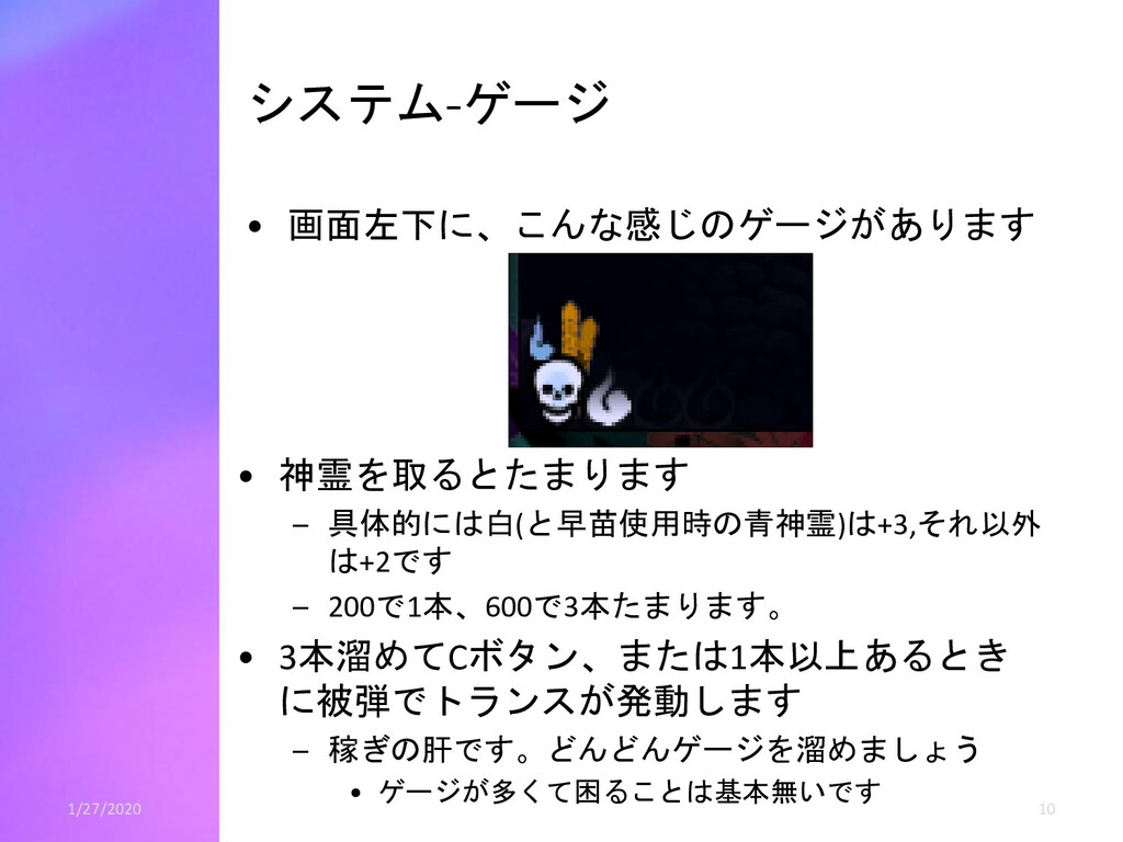 システム-ゲージ • 画面左下に、こんな感じのゲージがあります 1/27/2020 10 • 神霊を取るとたまります – 具体的には白(と早苗使用時の青神霊)は+3,それ以外 は+2です
