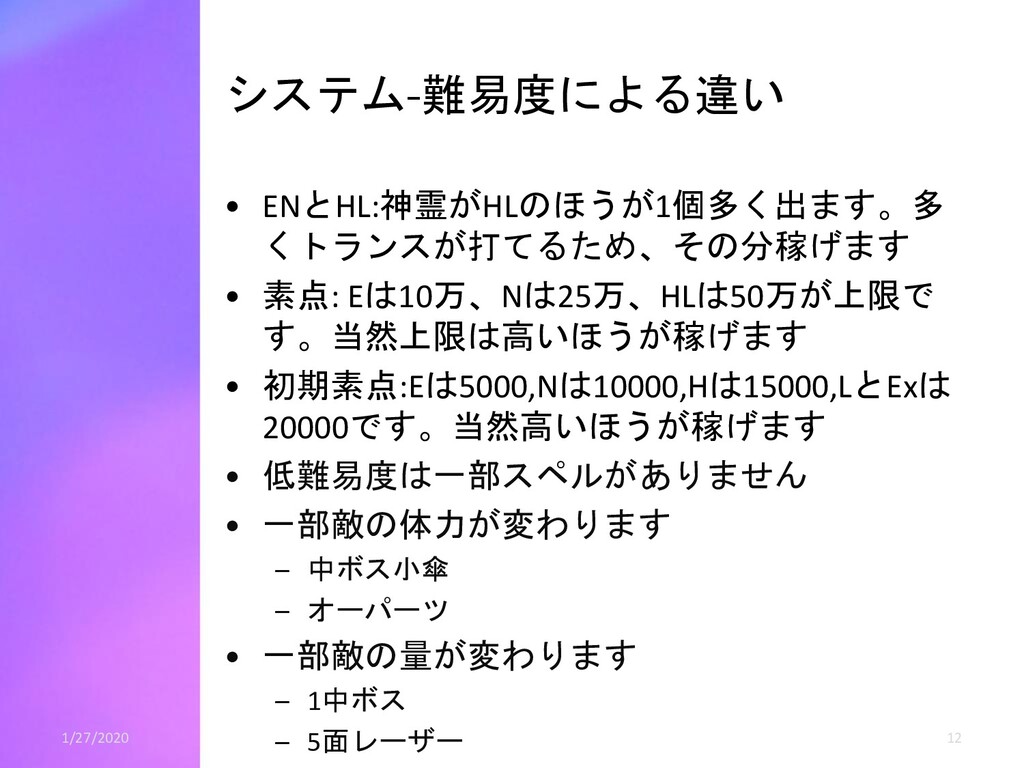 20000です。当然高いほうが稼げます • 低難易度は一部スペルがありません • 一部敵の体力が変わります – 中ボス小傘 – オーパーツ • 一部敵の量が変わります – 1中ボス – 5面レーザー 1/27/2020 12