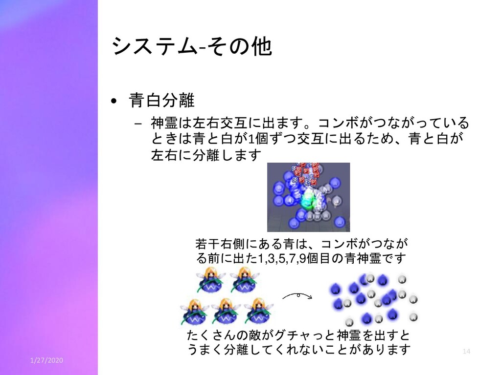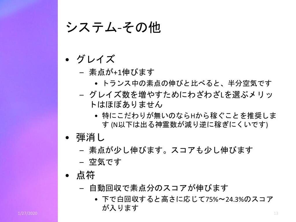 • 特にこだわりが無いのならHから稼ぐことを推奨しま す (N以下は出る神霊数が減り逆に稼ぎにくいです) • 弾消し – 素点が少し伸びます。スコアも少し伸びます – 空気です • 点符 – 自動回収で素点分のスコアが伸びます • 下で白回収すると高さに応じて75%~24.3%のスコア が入ります 1/27/2020 13