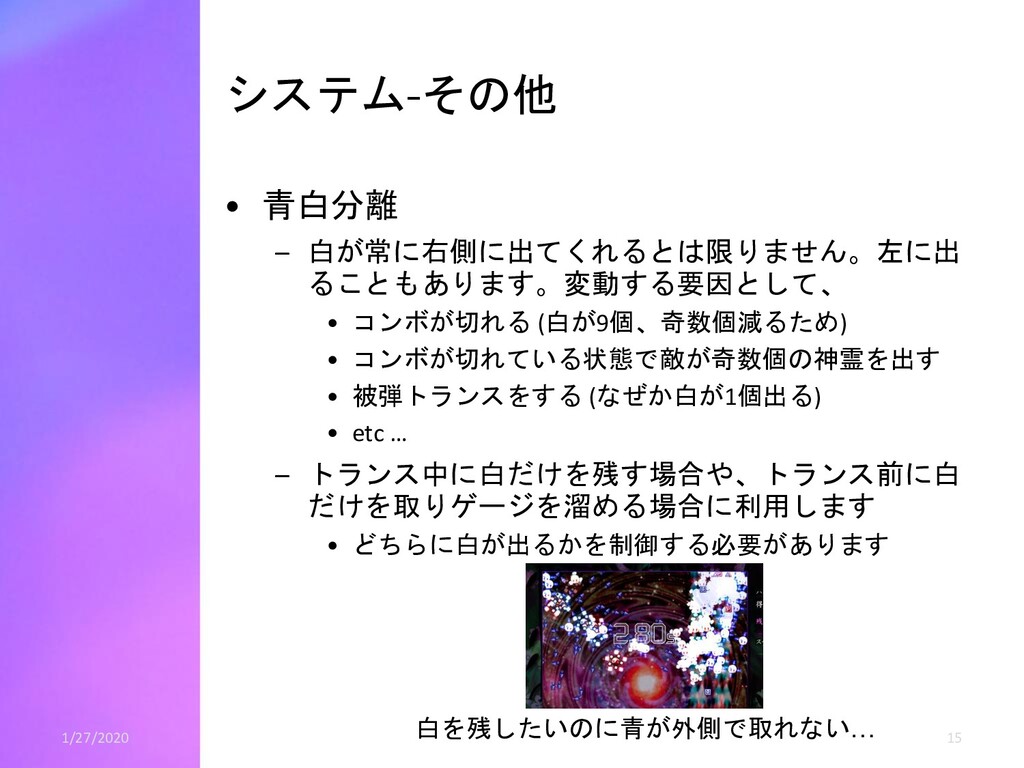 システム-その他 • 青白分離 – 神霊は左右交互に出ます。コンボがつながっている ときは青と白が1個ずつ交互に出るため、青と白が 左右に分離します 1/27/2020 14 若干右側にある青は、コンボがつなが