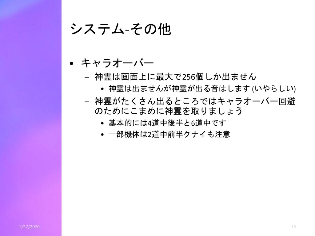 システム-その他 • キャラオーバー – 神霊は画面上に最大で256個しか出ません • 神霊は出ませんが神霊が出る音はします (いやらしい) – 神霊がたくさん出るところではキャラオーバー回避