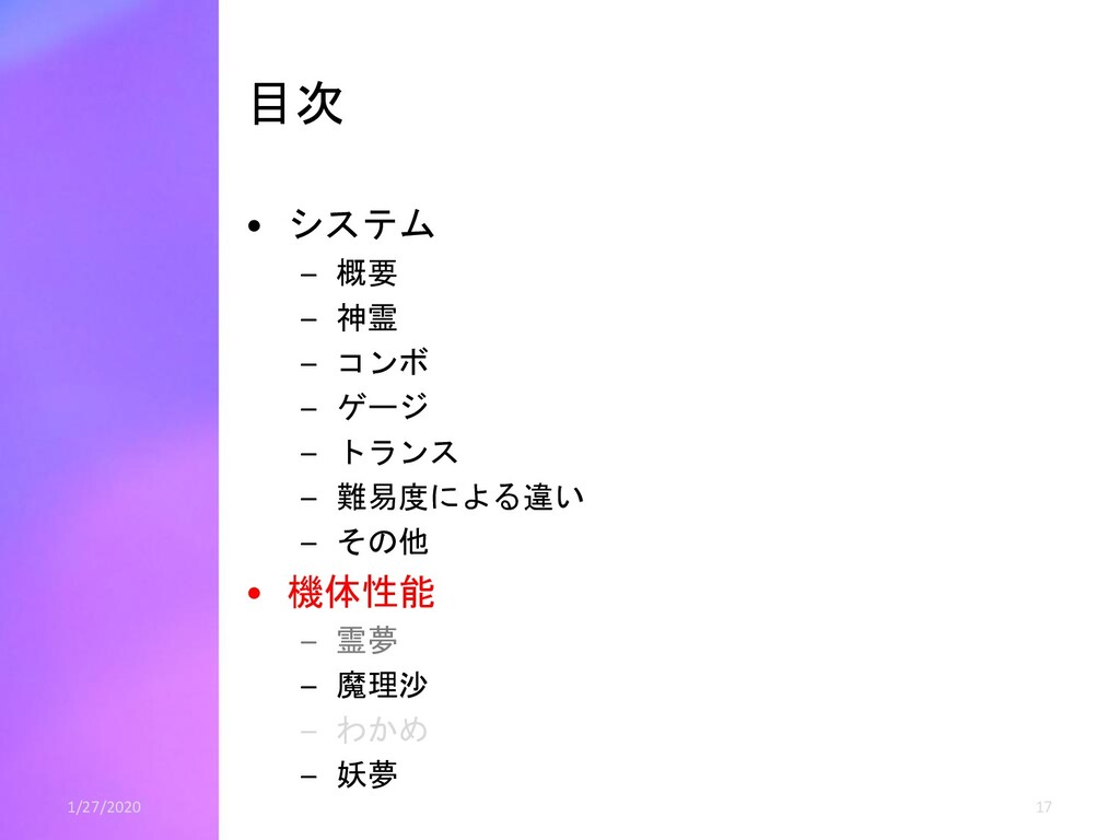 ゲージ – トランス – 難易度による違い – その他 • 機体性能 – 霊夢 – 魔理沙 – わかめ – 妖夢 1/27/2020 17