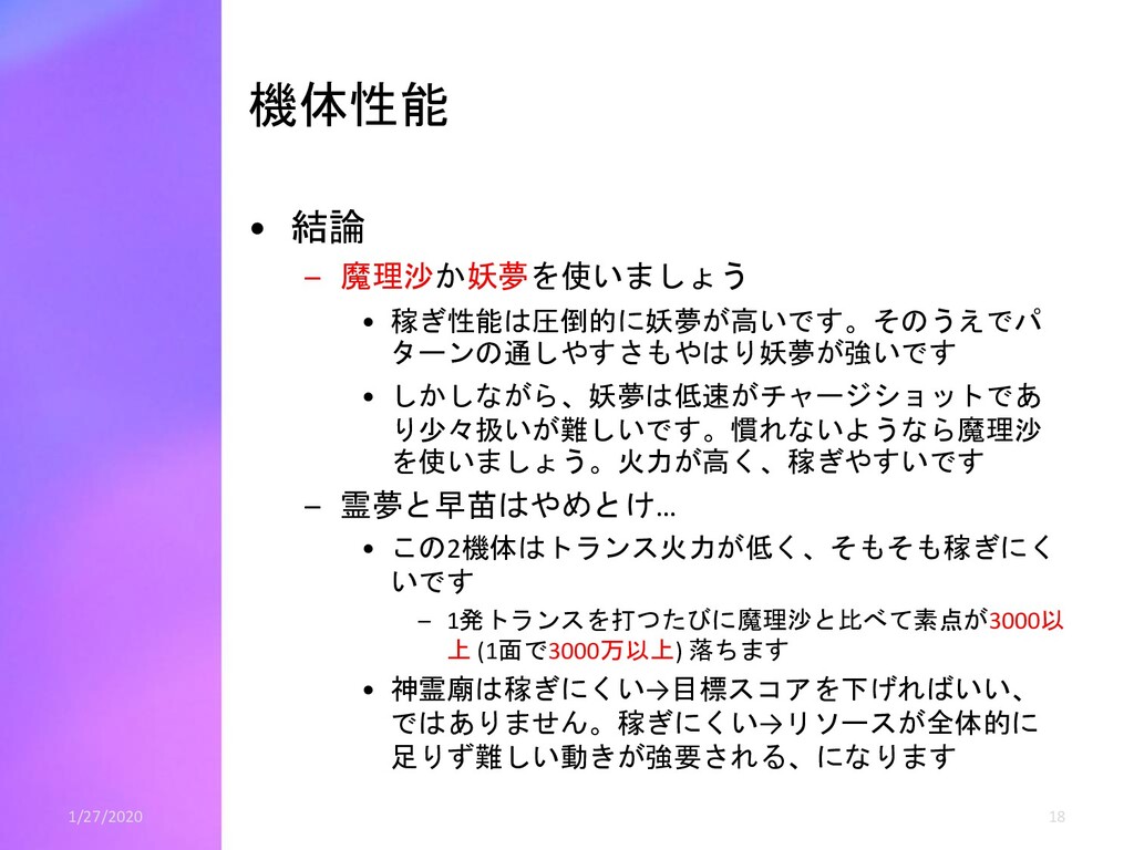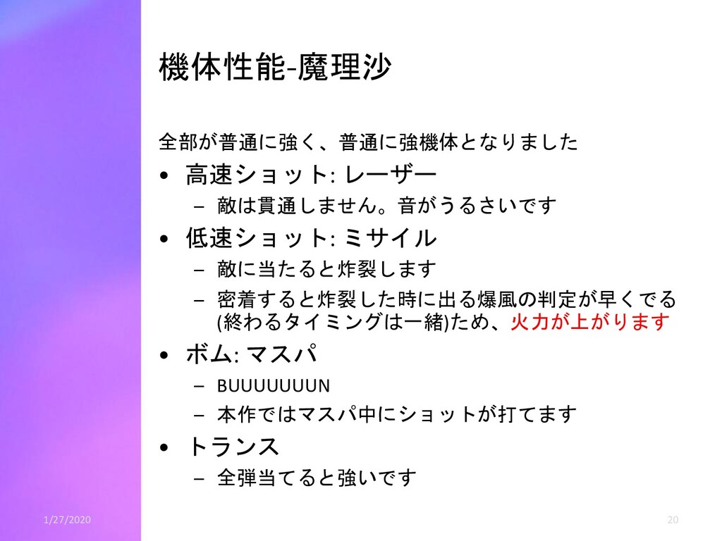 機体性能 1/27/2020 18 • 結論 – 魔理沙か妖夢を使いましょう • 稼ぎ性能は圧倒的に妖夢が高いです。そのうえでパ ターンの通しやすさもやはり妖夢が強いです