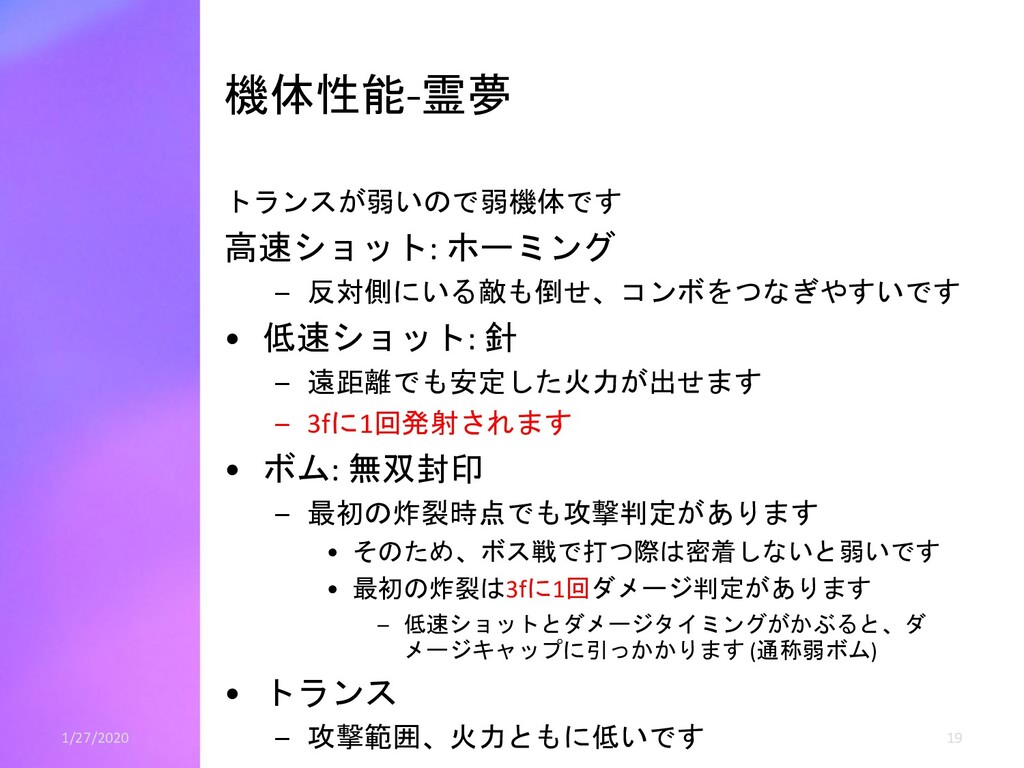 遠距離でも安定した火力が出せます – 3fに1回発射されます • ボム: 無双封印 – 最初の炸裂時点でも攻撃判定があります • そのため、ボス戦で打つ際は密着しないと弱いです • 最初の炸裂は3fに1回ダメージ判定があります – 低速ショットとダメージタイミングがかぶると、ダ メージキャップに引っかかります (通称弱ボム) • トランス – 攻撃範囲、火力ともに低いです 1/27/2020 19