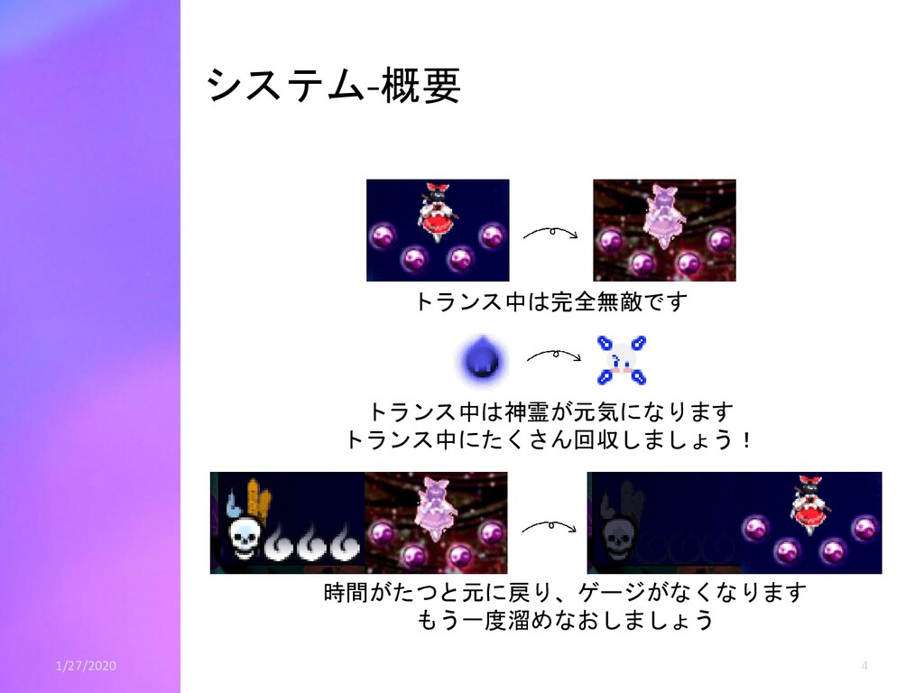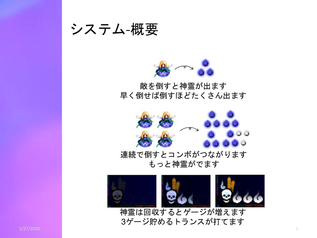 システム-概要 1/27/2020 3 敵を倒すと神霊が出ます 早く倒せば倒すほどたくさん出ます 連続で倒すとコンボがつながります もっと神霊がでます 神霊は回収するとゲージが増えます 3ゲージ貯めるトランスが打てます