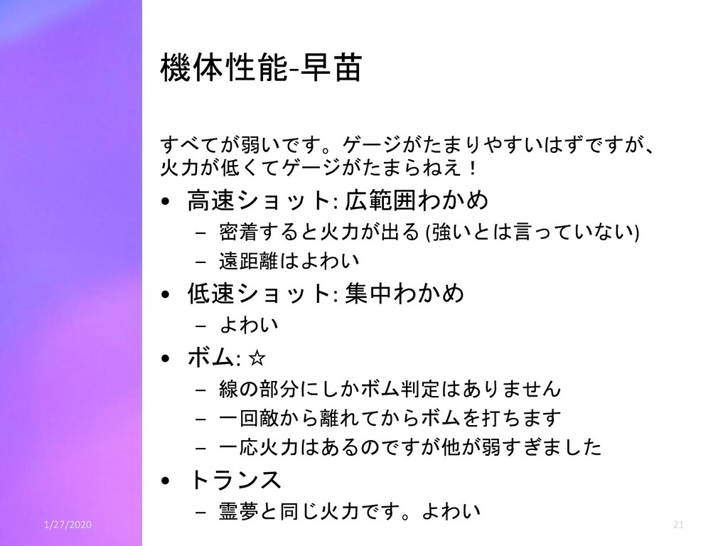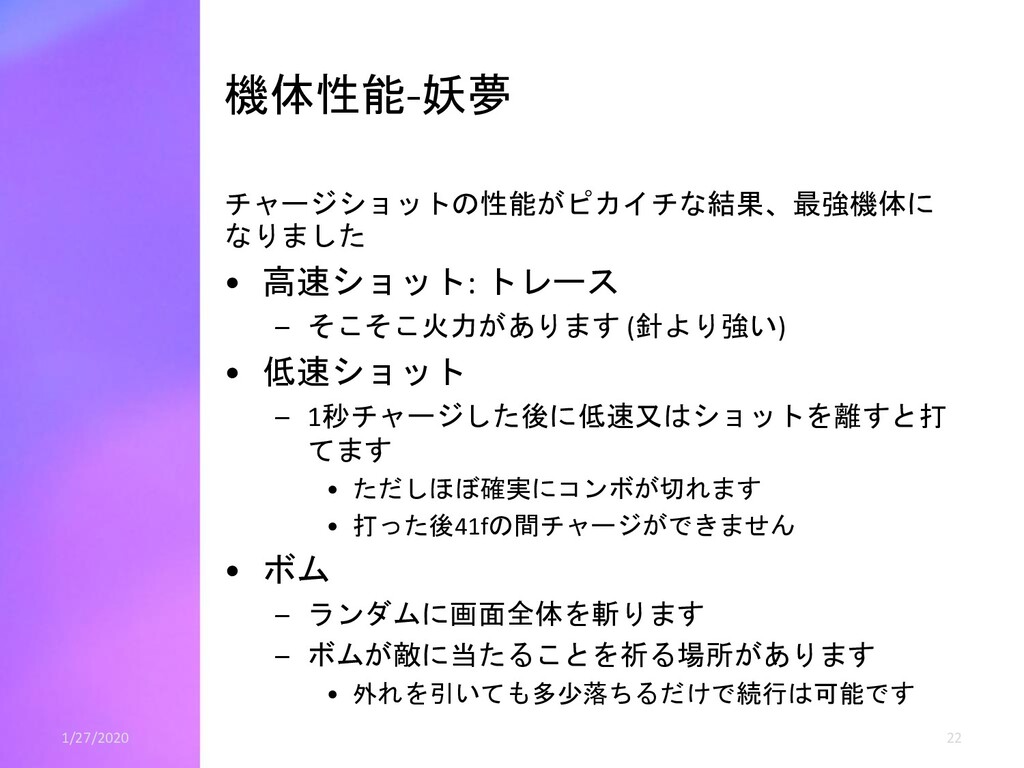遠距離はよわい • 低速ショット: 集中わかめ – よわい • ボム: ☆ – 線の部分にしかボム判定はありません – 一回敵から離れてからボムを打ちます – 一応火力はあるのですが他が弱すぎました • トランス – 霊夢と同じ火力です。よわい 1/27/2020 21