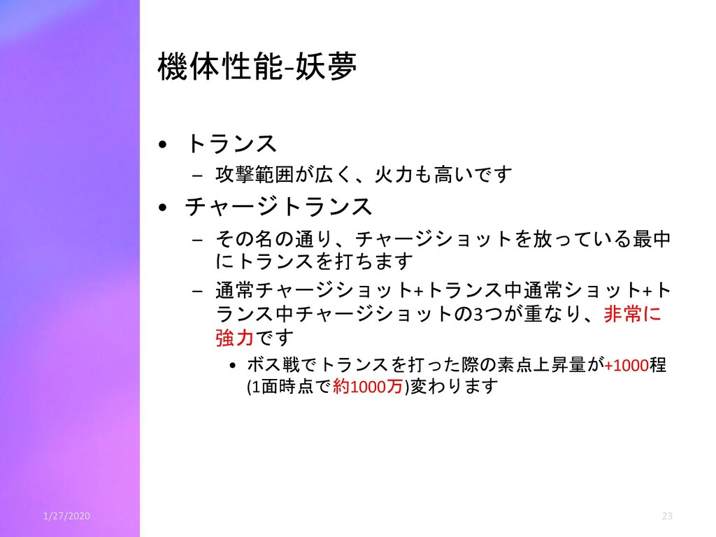 – 通常チャージショット+トランス中通常ショット+ト ランス中チャージショットの3つが重なり、非常に 強力です • ボス戦でトランスを打った際の素点上昇量が+1000程 (1面時点で約1000万)変わります 1/27/2020 23