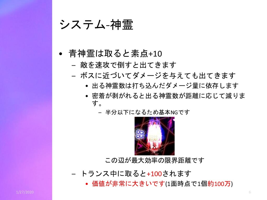 密着が剥がれると出る神霊数が距離に応じて減りま す。 – 半分以下になるため基本NGです 1/27/2020 6 – トランス中に取ると+100されます • 価値が非常に大きいです(1面時点で1個約100万) この辺が最大効率の限界距離です