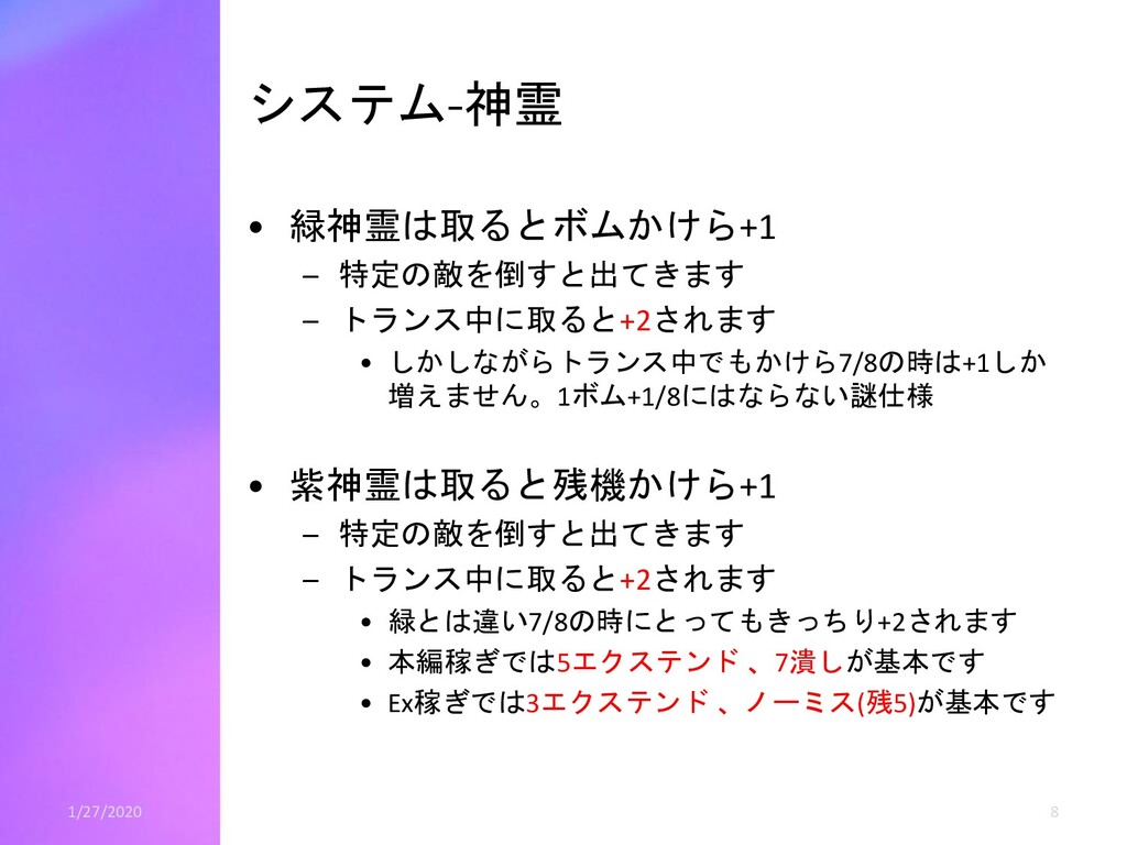 • 紫神霊は取ると残機かけら+1 – 特定の敵を倒すと出てきます – トランス中に取ると+2されます • 緑とは違い7/8の時にとってもきっちり+2されます • 本編稼ぎでは5エクステンド 、7潰しが基本です • Ex稼ぎでは3エクステンド 、ノーミス(残5)が基本です 1/27/2020 8