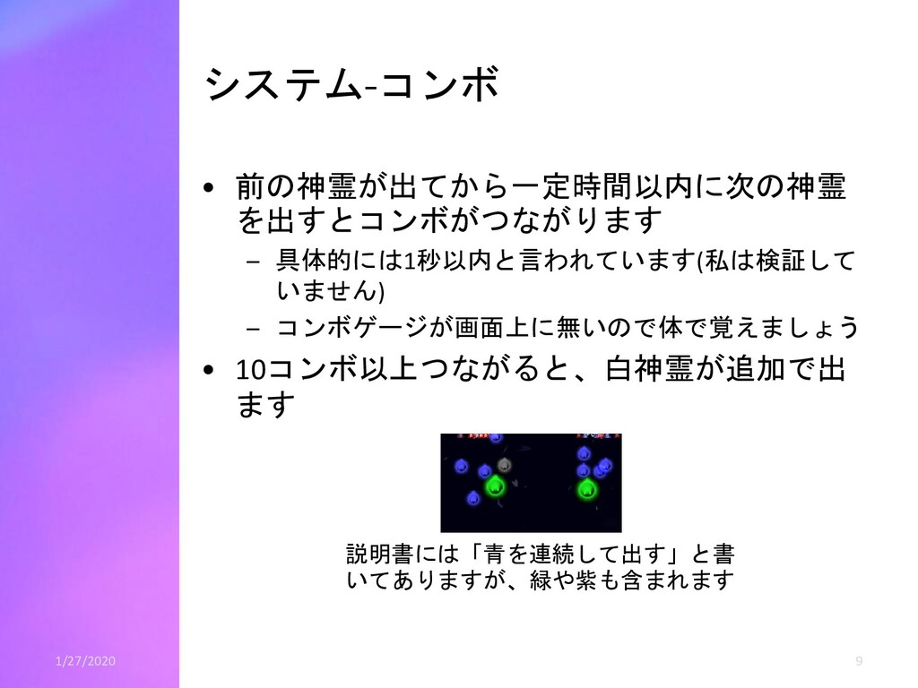 システム-コンボ • 前の神霊が出てから一定時間以内に次の神霊 を出すとコンボがつながります – 具体的には1秒以内と言われています(私は検証して いません) – コンボゲージが画面上に無いので体で覚えましょう •