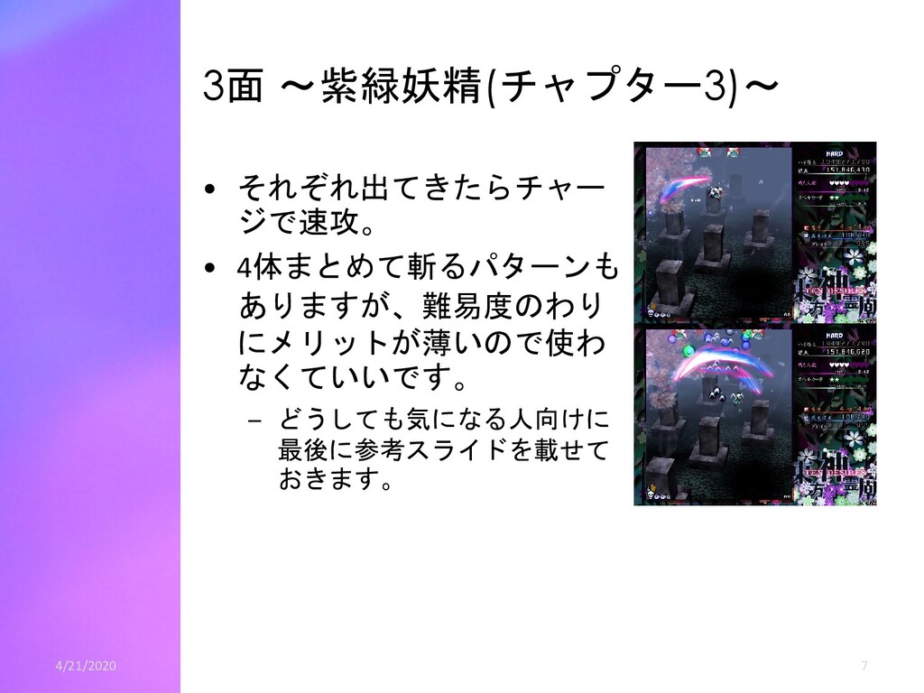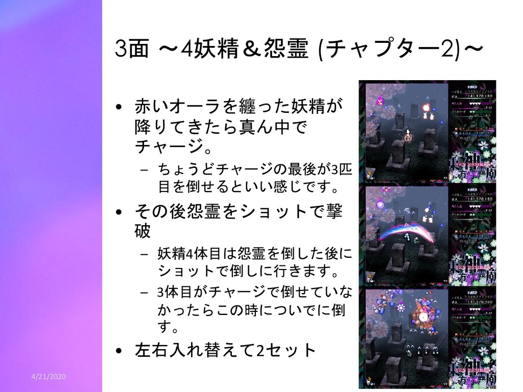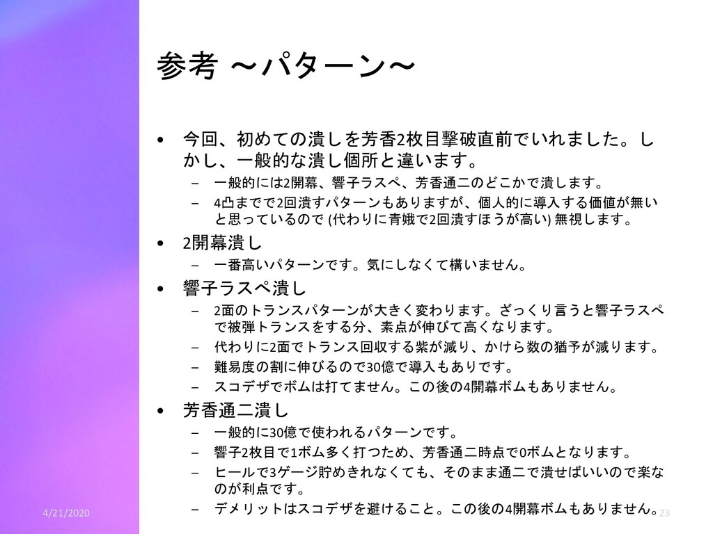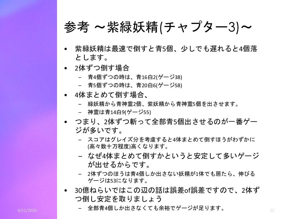 青5個ずつの時は、青20白6(ゲージ58) • 4体まとめて倒す場合、 – 緑妖精から青神霊2個、紫妖精から青神霊5個を出させます。 – 神霊は青14白9(ゲージ55) • つまり、2体ずつ斬って全部青5個出させるのが一番ゲー ジが多いです。 – スコアはグレイズ分を考慮すると4体まとめて倒すほうがわずかに (高々数十万程度)高くなります。 – なぜ4体まとめて倒すかというと安定して多いゲージ が出せるからです。 – 2体ずつのほうは青4個しか出さない妖精が1体でも居たら、伸びる ゲージは53になります。 • 30億ねらいではこの辺の話は誤差of誤差ですので、2体ず つ倒し安定を取りましょう – 全部青4個しか出さなくても余裕でゲージが足ります。 4/21/2020 22