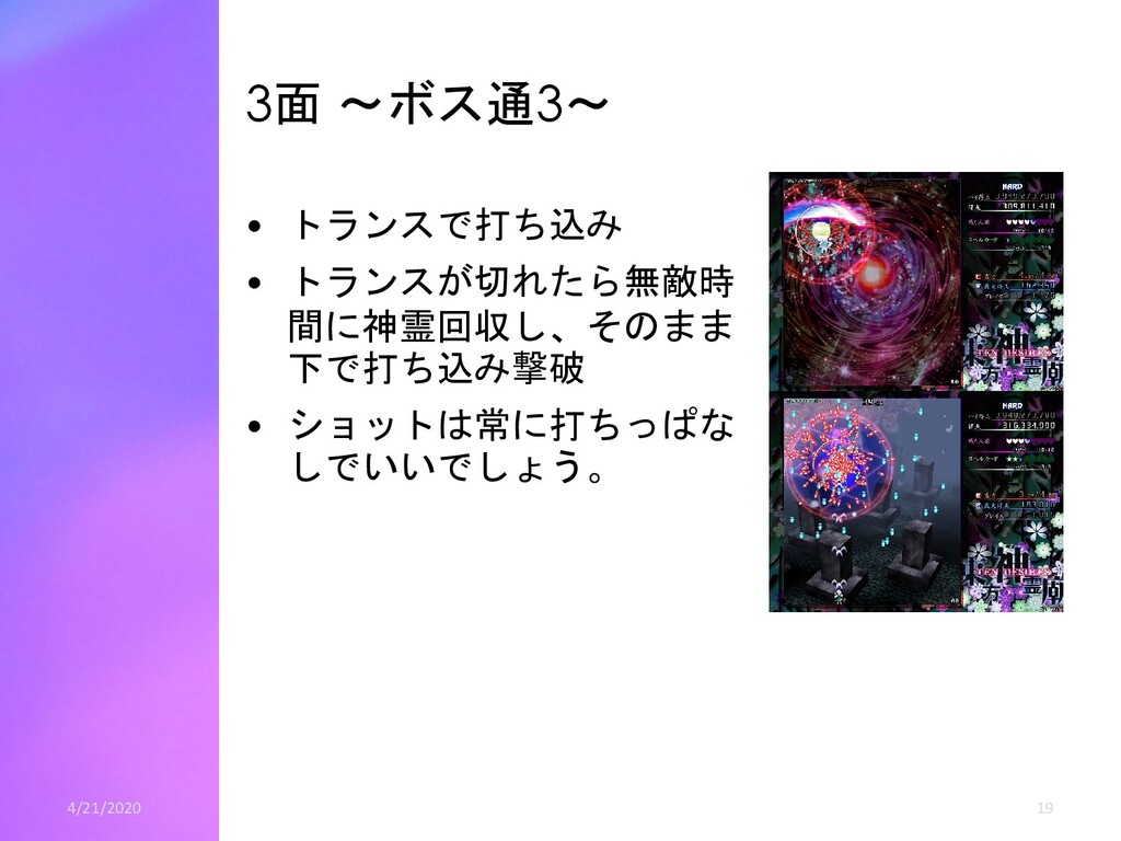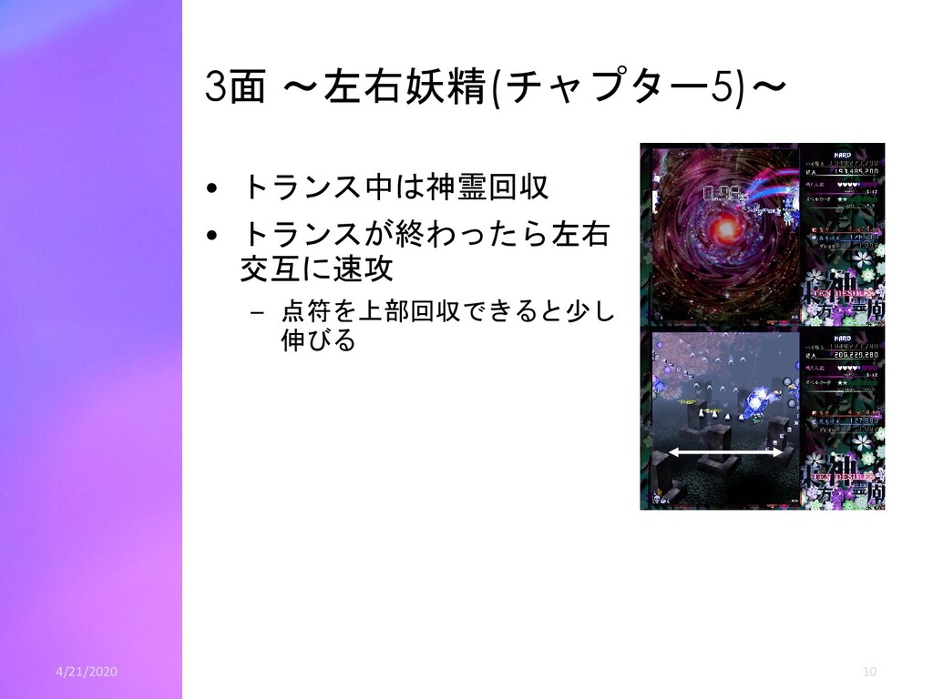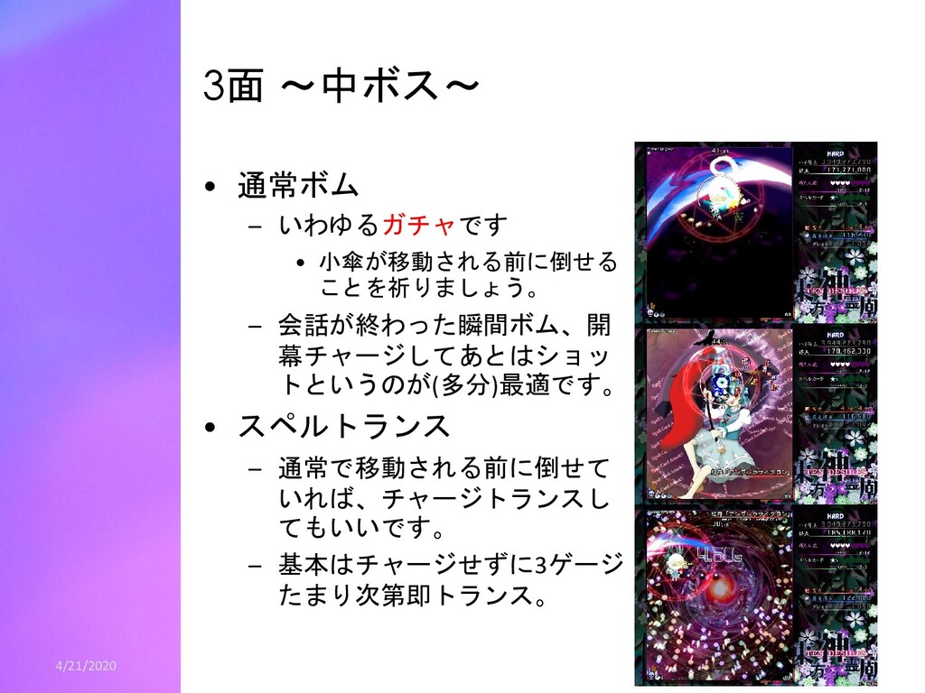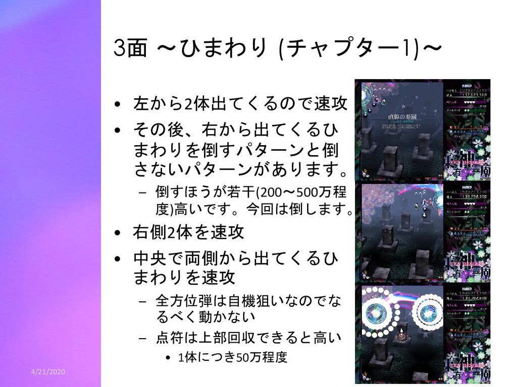 青5個ずつの時は、青20白6(ゲージ58) • 4体まとめて倒す場合、 – 緑妖精から青神霊2個、紫妖精から青神霊5個を出させます。 – 神霊は青14白9(ゲージ55) • つまり、2体ずつ斬って全部青5個出させるのが一番ゲー ジが多いです。 – スコアはグレイズ分を考慮すると4体まとめて倒すほうがわずかに (高々数十万程度)高くなります。 – なぜ4体まとめて倒すかというと安定して多いゲージ が出せるからです。 – 2体ずつのほうは青4個しか出さない妖精が1体でも居たら、伸びる ゲージは53になります。 • 30億ねらいではこの辺の話は誤差of誤差ですので、2体ず つ倒し安定を取りましょう – 全部青4個しか出さなくても余裕でゲージが足ります。 4/21/2020 22