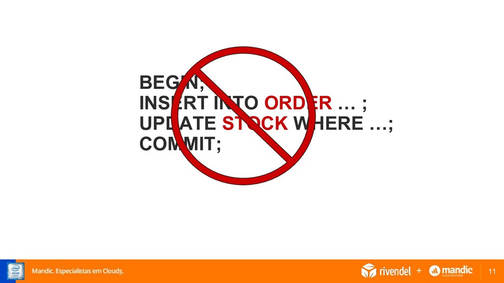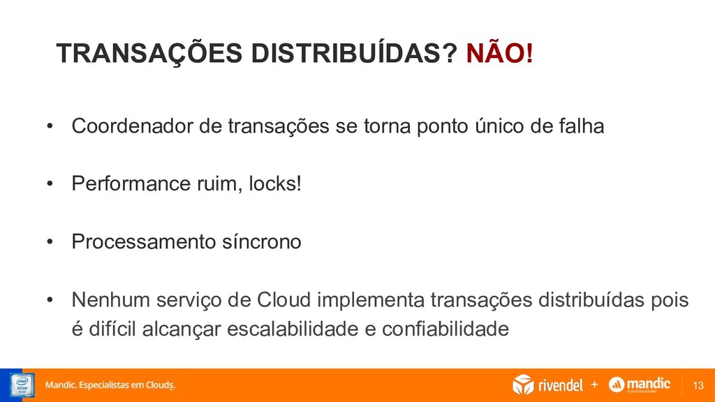ponto único de falha • Performance ruim, locks! • Processamento síncrono • Nenhum serviço de Cloud implementa transações distribuídas pois é difícil alcançar escalabilidade e confiabilidade +
