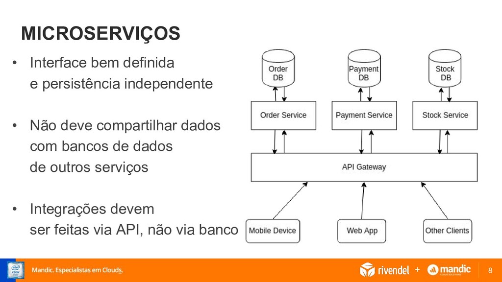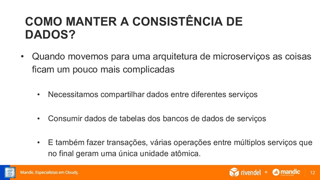 para uma arquitetura de microserviços as coisas ficam um pouco mais complicadas • Necessitamos compartilhar dados entre diferentes serviços • Consumir dados de tabelas dos bancos de dados de serviços • E também fazer transações, várias operações entre múltiplos serviços que no final geram uma única unidade atômica. +