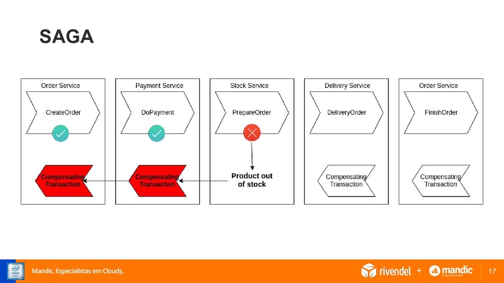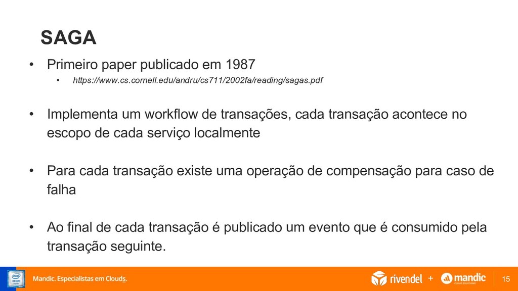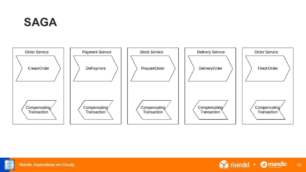 • Implementa um workflow de transações, cada transação acontece no escopo de cada serviço localmente • Para cada transação existe uma operação de compensação para caso de falha • Ao final de cada transação é publicado um evento que é consumido pela transação seguinte. +