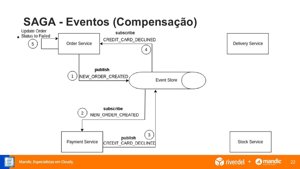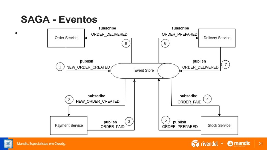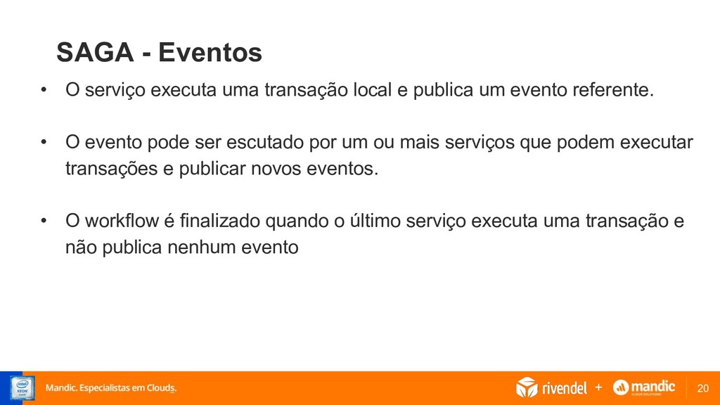 local e publica um evento referente. • O evento pode ser escutado por um ou mais serviços que podem executar transações e publicar novos eventos. • O workflow é finalizado quando o último serviço executa uma transação e não publica nenhum evento +
