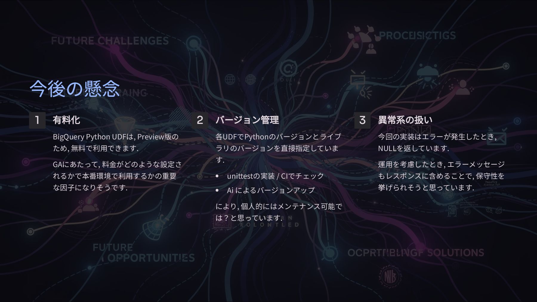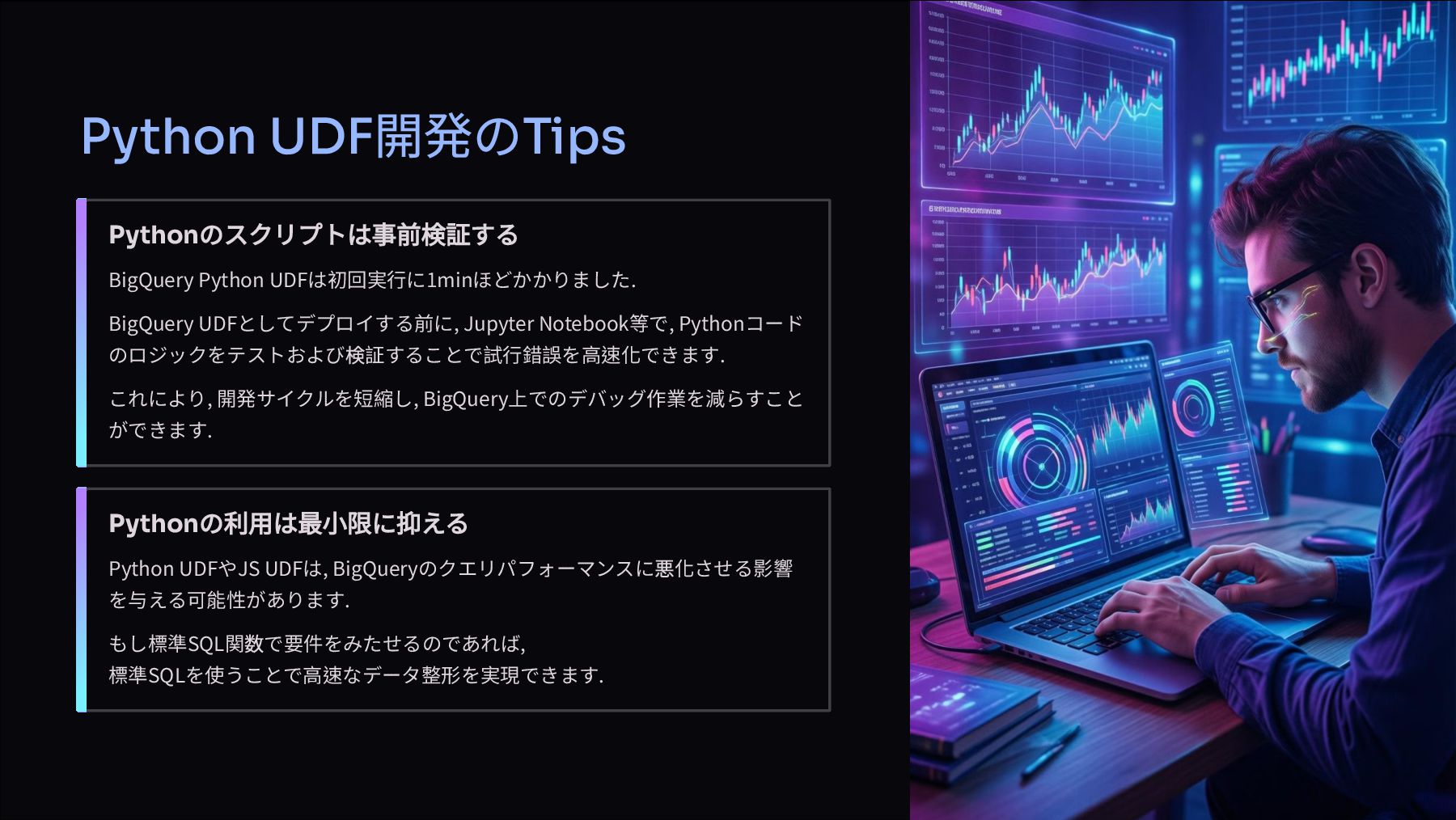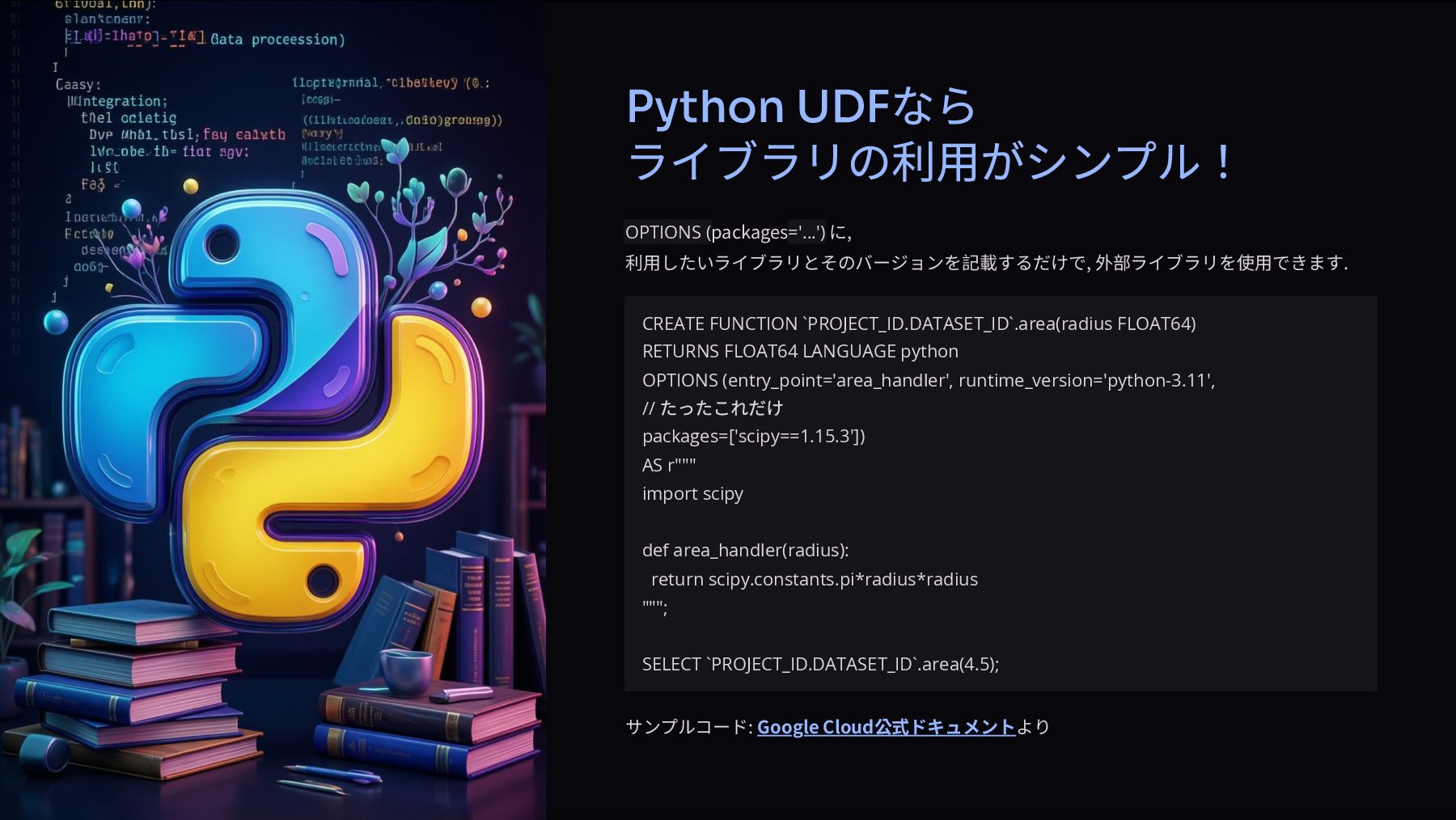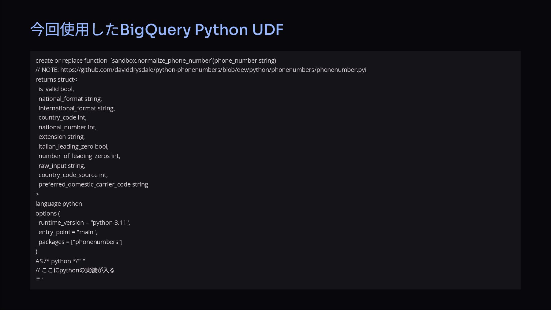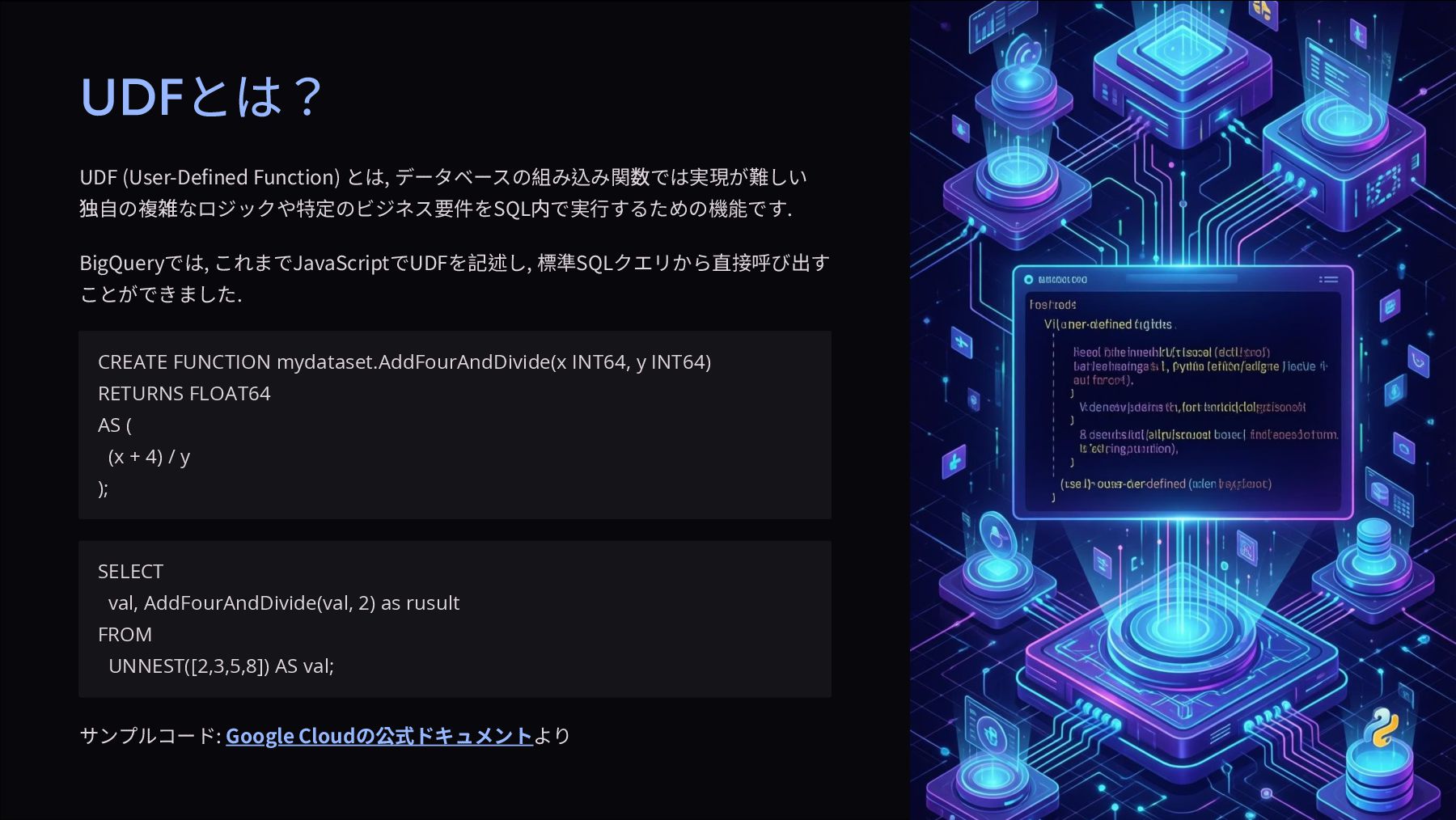 BigQueryw, s¼~wJavaScriptwUDF²ÿw, {þSQL¿¸ú{¹öç|sûy sx|w}~w. CREATE FUNCTION mydataset.AddFourAndDivide(x INT64, y INT64) RETURNS FLOAT64 AS ( (x + 4) / y ); SELECT val, AddFourAndDivide(val, 2) as rusult FROM UNNEST([2,3,5,8]) AS val; µó÷û³üù: Google Cloud~}_ù½õñóø¸º
