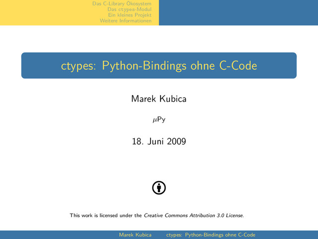 ctypes: Python-Bindings ohne C-Code Marek Kubica µPy 18. Juni 2009 This work is licensed under the Creative Commons Attribution 3.0 License. Marek Kubica ctypes: Python-Bindings ohne C-Code