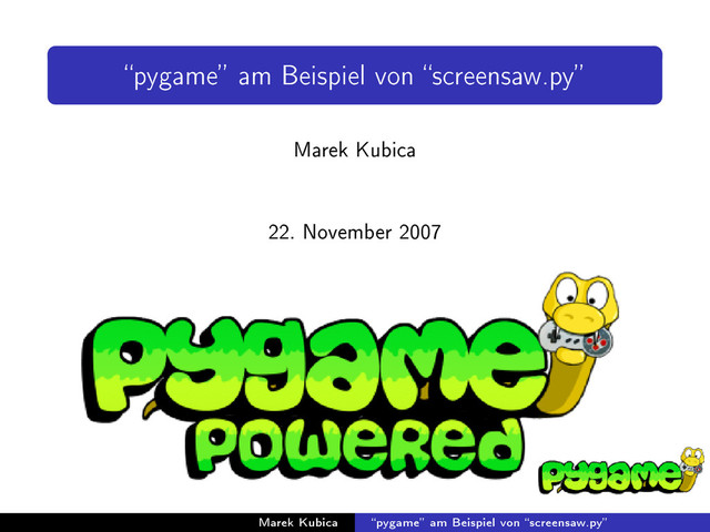 Demos Fade: Überblendung von schwarz nach weiÿ und zurück. Der Trenner sozusagen Critter: Zwei zufällige Punkte mit weiÿer Linie verbinden Ant: eine Art Ameise lauft über den Bildschirm Popsquares: blinkende blaue Kästen Cube: Ein Gamecube-ähnliches Logo aus Sechsecken konstruiert Freefall: Freier Fall Marek Kubica pygame am Beispiel von screensaw.py