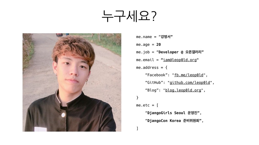 " me.address = { “Facebook”: "fb.me/leop0ld", “GitHub”: "github.com/leop0ld", “Blog”: "blog.leop0ld.org", } me.etc = [ “DjangoGirls Seoul ”, “DjangoCon Korea ળ࠺ਤਗഥ”, ]