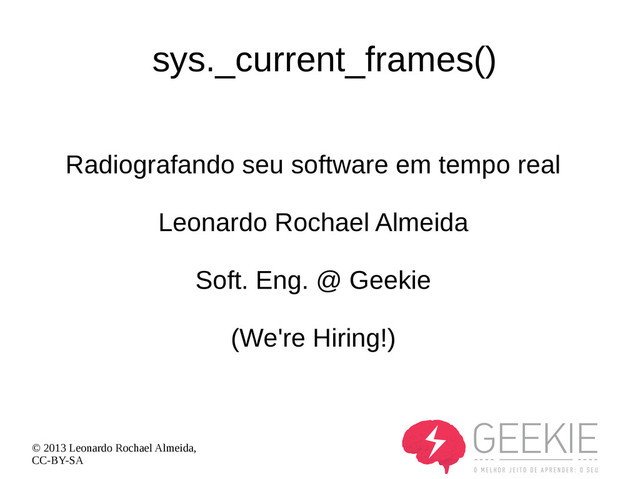 Frame? • Imprimir todo o stack de uma thread >>> import traceback >>> traceback.print_stack(frame) File "[...]/bin/ipython", line 9, in <module> load_entry_point('ipython==0.13.2', 'console_scripts', 'ipython')() File "[...]/terminal/ipapp.py", line 389, in launch_new_instance app.start() [...] File "[...]/core/interactiveshell.py", line 2745, in run_code return outflag File "<ipython-input-5-f0e996c7314a>", line 1, in <module> frame = sys._current_frames()[thread_id]