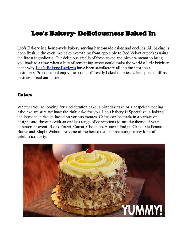 Leo's Bakery is a home-style bakery serving hand-made cakes and cookies. All baking is done fresh in the oven. we bake everything from apple pie to Red Velvet cupcakes using the finest ingredients. Our delicious smells of fresh cakes and pies are meant to bring you back to a time when a bite of something sweet could make the world a little brighter that's why Leo's Bakery Reviews have been satisfactory all the time for their customers. So come and enjoy the aroma of freshly baked cookies, cakes, pies, muffins, pastries, bread and more.
