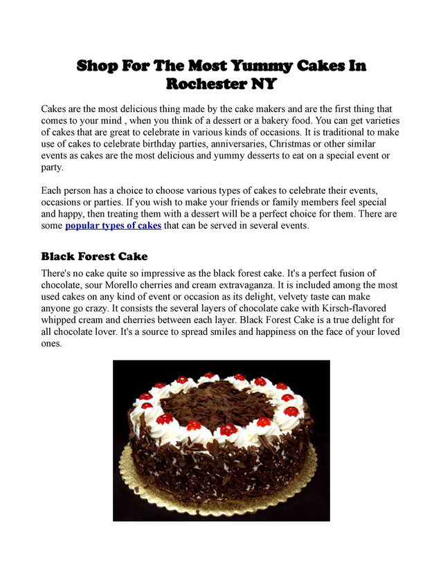 are the most delicious thing made by the cake makers and are the first thing that comes to your mind , when you think of a dessert or a bakery food. You can get varieties of cakes that are great to celebrate in various kinds of occasions. It is traditional to make use of cakes to celebrate birthday parties, anniversaries, Christmas or other similar events as cakes are the most delicious and yummy desserts to eat on a special event or party. Each person has a choice to choose various types of cakes to celebrate their events, occasions or parties. If you wish to make your friends or family members feel special and happy, then treating them with a dessert will be a perfect choice for them. There are some popular types of cakes that can be served in several events. Black Forest Cake There's no cake quite so impressive as the black forest cake. It's a perfect fusion of chocolate, sour Morello cherries and cream extravaganza. It is included among the most used cakes on any kind of event or occasion as its delight, velvety taste can make anyone go crazy. It consists the several layers of chocolate cake with Kirsch-flavored whipped cream and cherries between each layer. Black Forest Cake is a true delight for all chocolate lover. It's a source to spread smiles and happiness on the face of your loved ones.