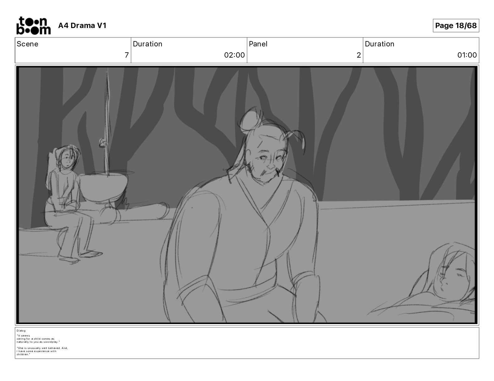 Dialog " It seem s car ing for a child com es as nat ur ally to you as swordplay." " She is unusually well behaved. And, I have som e exper ience wit h children." A4 Drama V1 Page 18/68