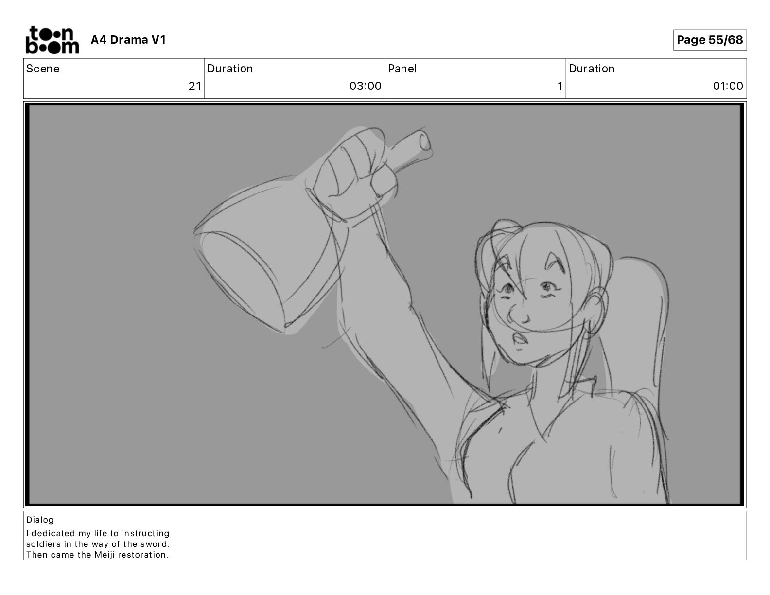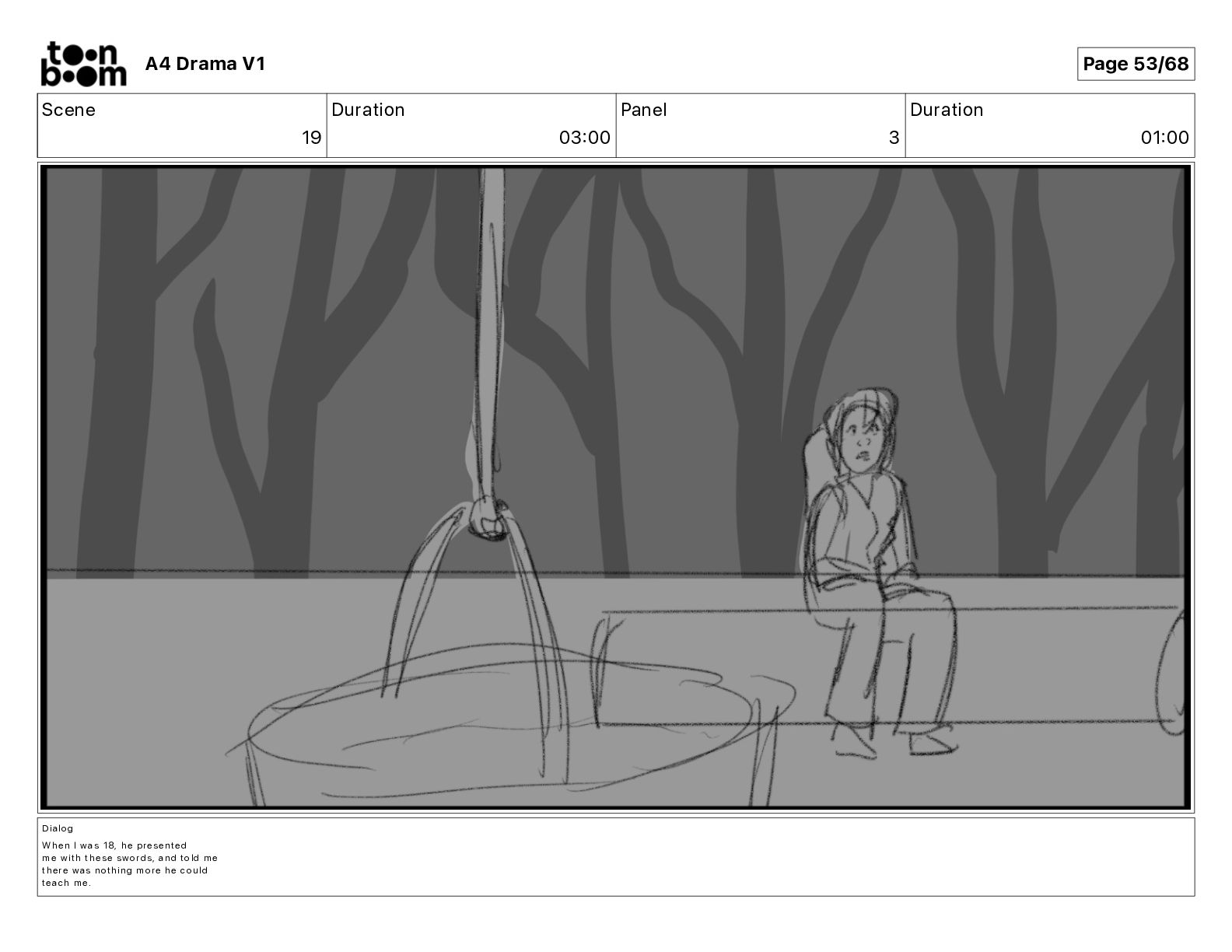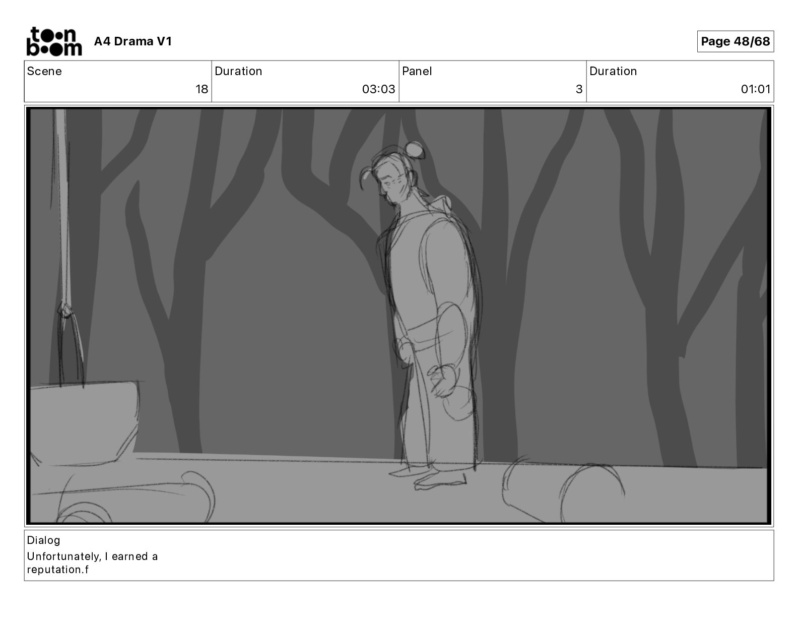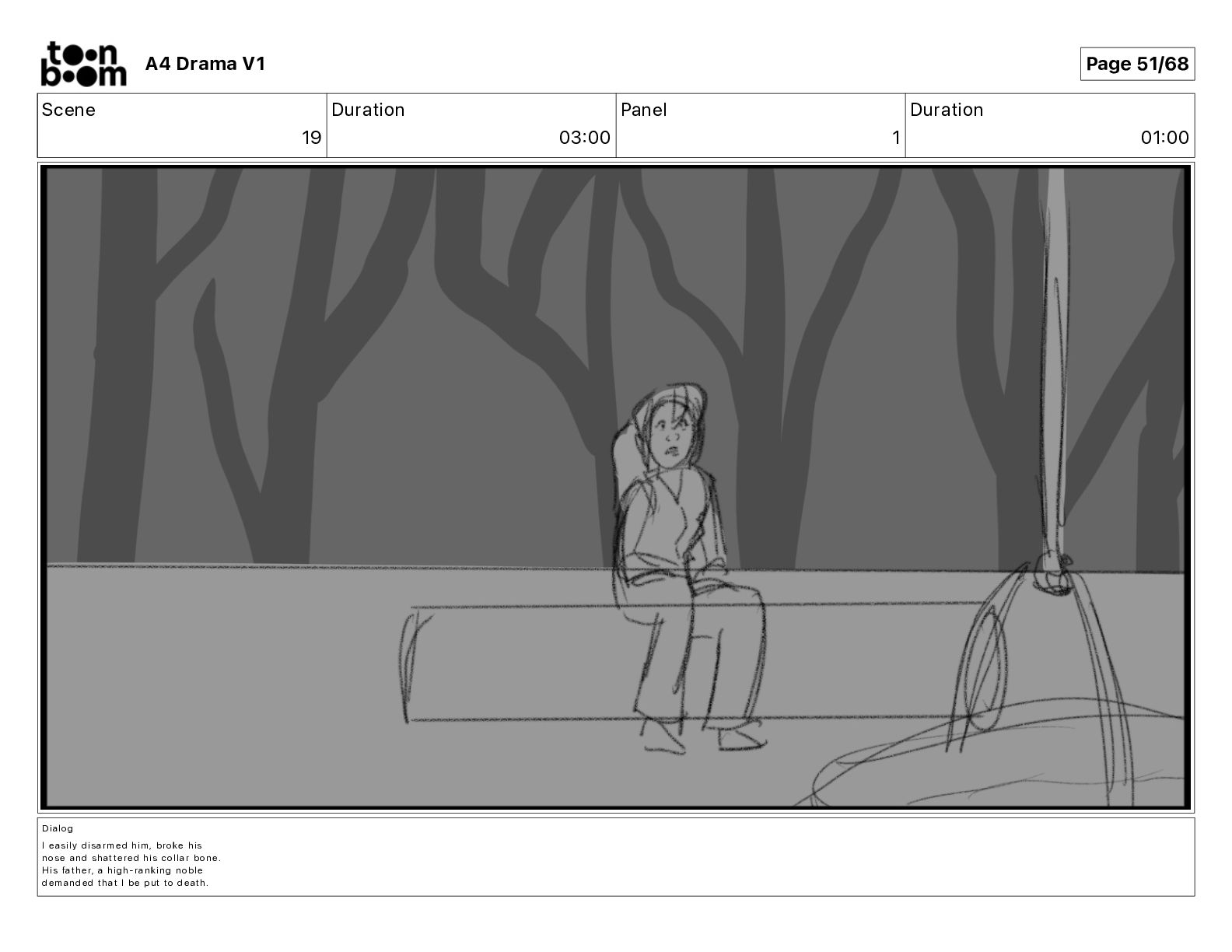 Dialog I easily disarmed him, broke his nose and shattered his collar bone. His father, a high-ranking noble demanded that I be put to death. A4 Drama V1 Page 51/68