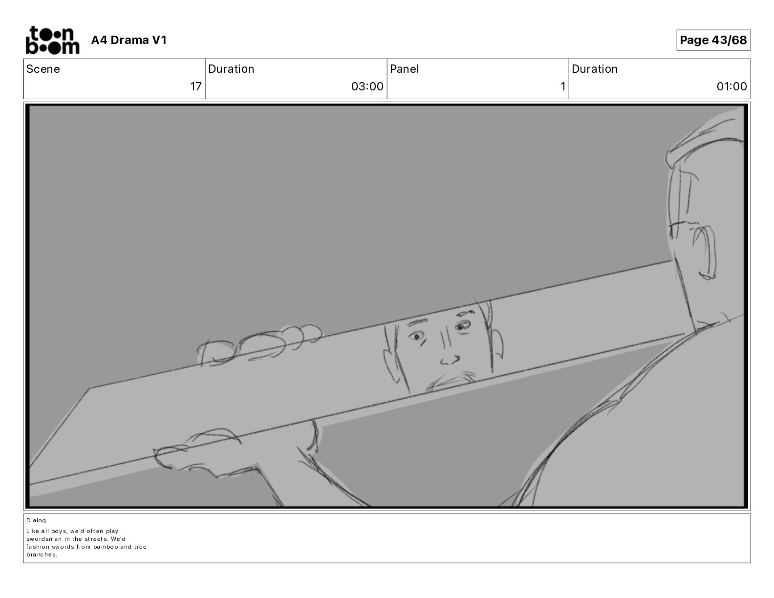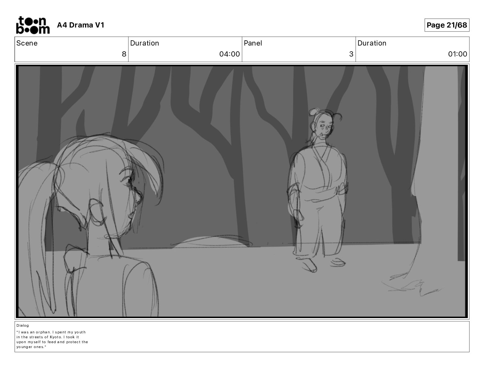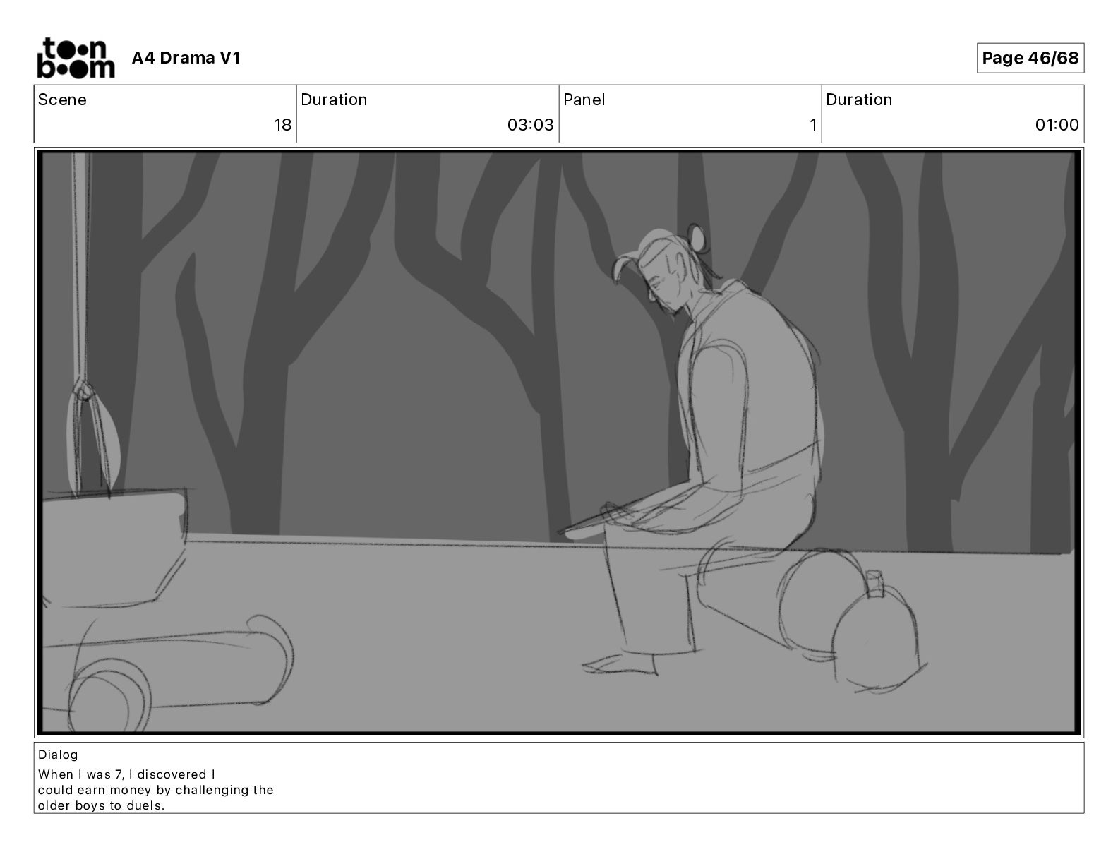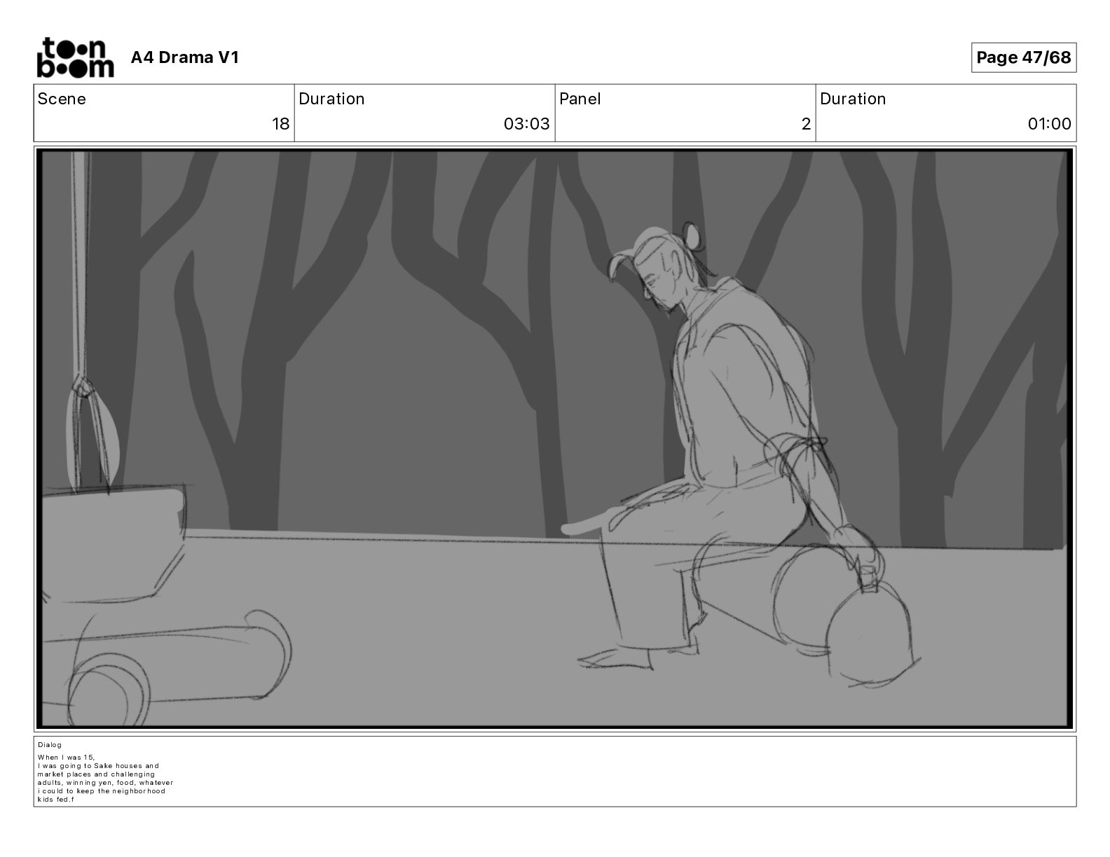 Dialog When I was 15, I was going to Sake houses and mar ket places and challenging adults, winning yen, food, whatever i could to keep the neighbor hood kids fed. f A4 Drama V1 Page 47/68