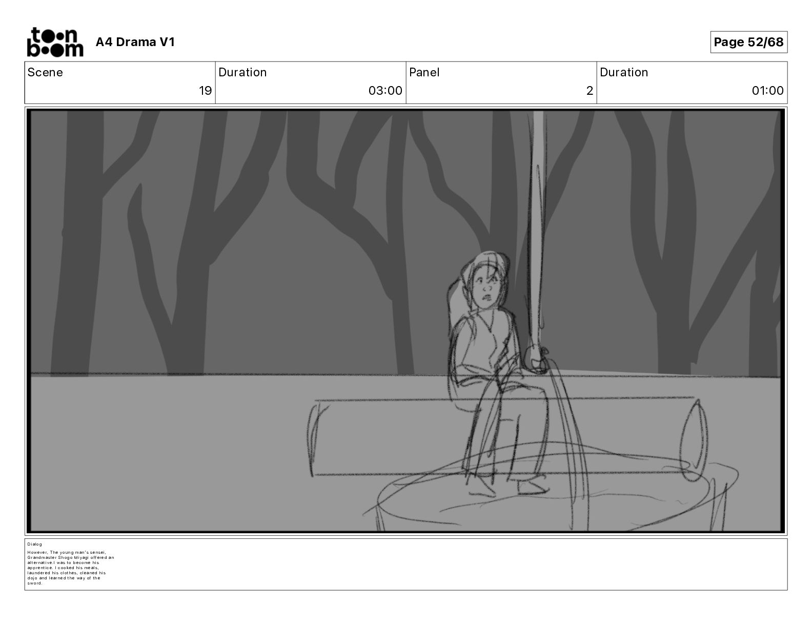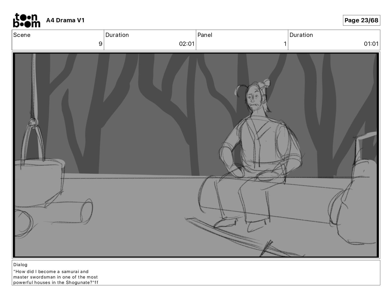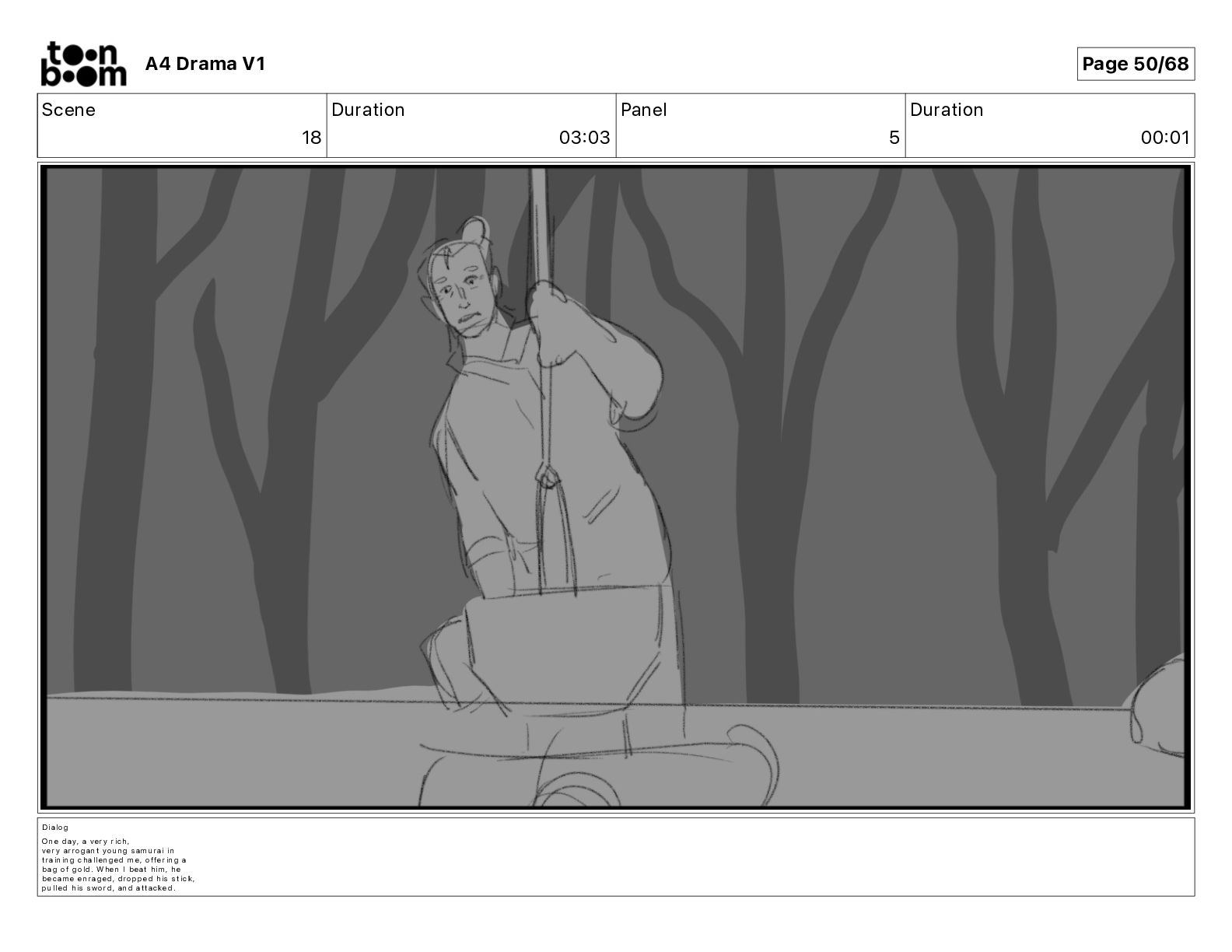 Dialog One day, a ver y r ich, ver y ar rogant young samurai in training challenged me, offer ing a bag of gold. When I beat him, he became enraged, dropped his stick, pulled his sword, and attacked. A4 Drama V1 Page 50/68