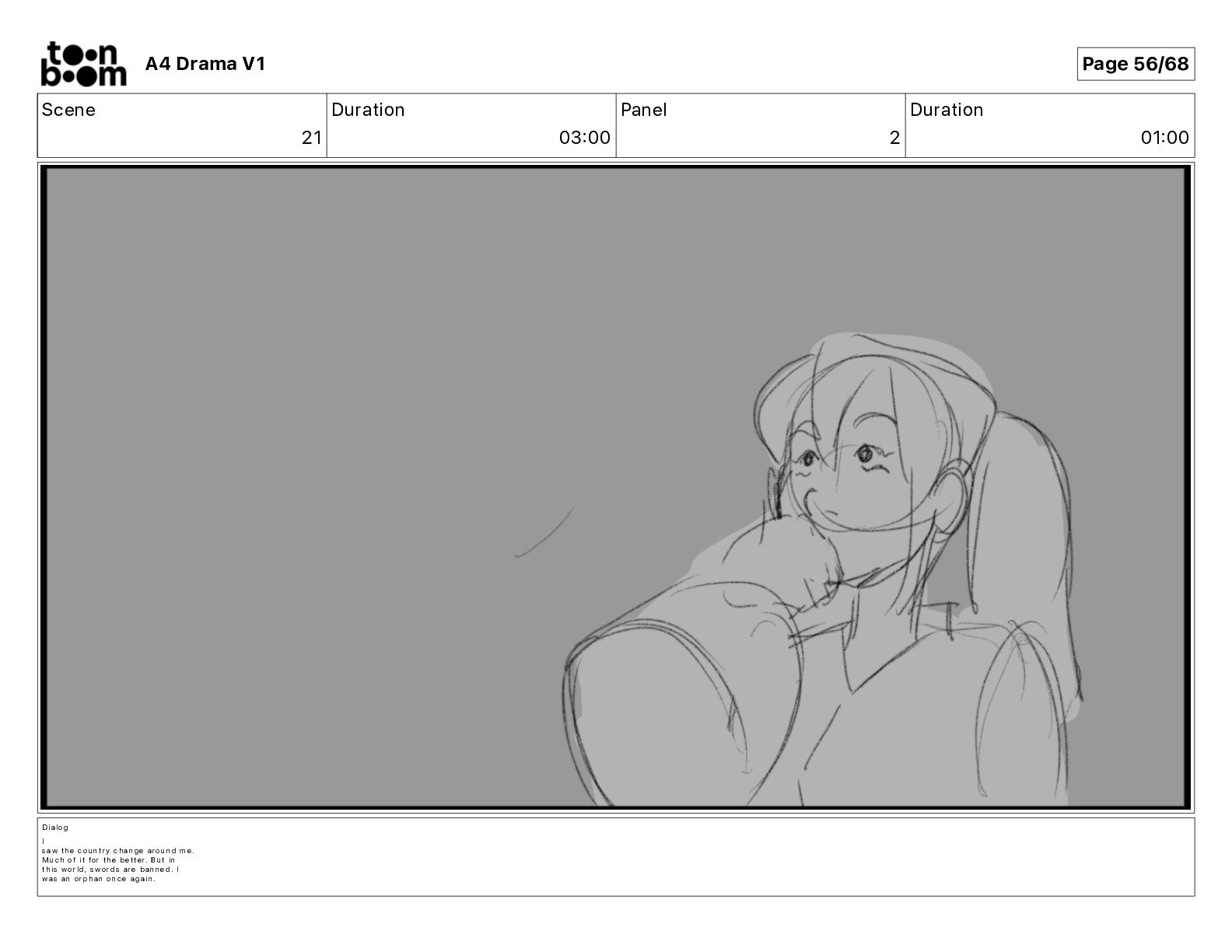 Dialog I saw the countr y change around me. Much of it for the better. But in this wor ld, swords are banned. I was an or phan once again. A4 Drama V1 Page 56/68