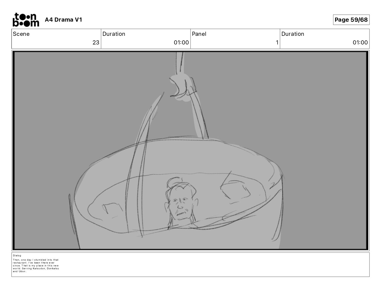 Dialog Then, one day I stumbled into that restaurant. Iʼ ve been there ever since. That is my place in this new wor ld. Ser ving Katsudon, Donkatsu and Udon. A4 Drama V1 Page 59/68