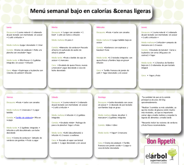 zumo natural • 1 rebanada de pan tostado con mermelada sin azúcar • 1 café o infusión • Media mañana:•yogur desnatado • 1 kiwi Comida: •Crema de calabacín • Pollo a la plancha con ensalada• Yogur Media tarde: • Piña fresca • 1-2 galletas integrales sin azúcar • Infusión Cena: •Sopa • Espárragos a la plancha con 1 loncha de salmón• Infusión Martes Desayuno :• 1 yogur con cereales • 1 kiwi• 1 café con leche o infusión Media mañana:•1 pera • Comida: •Menestra de verduras• Pescado al horno (1 cucharada de aceite de oliva)+1 patata• Media tarde: •Fruta o batido de soja sin azúcar • 1 manzana Cena: • Ensalada de queso fresco, nueces y manzana• yogur desnatado o vaso de leche desnatada Miércoles Desayuno :•Fruta • Leche con cereales Media mañana:• 1 yogur bebible bajo en azúcar Comida: •Garbanzos con espinacas y bacalao• Fruta Media tarde: •1-2 tostadas integrales con queso fresco y fiambre bajo en grasa• infusión Cena: • Tortilla francesa de jamón de york • Yogur desnatado y sin azúcar Jueves Desayuno :• 1 zumo natural • 1 rebanada de pan tostado con mermelada sin azúcar • 1 café o infusión • Media mañana:• 1 infusión• compota de manzana con 1-2 nueces Comida: • Ensalada de tomate• Carne a la plancha con arroz (40 g peso sin cocinar) • Yogur Media tarde: • 1-2 lonchas de fiambre bajo con 1-2 rebanadas de pan tostado integral Cena: • Yogur y fruta Viernes Desayuno :•Fruta • Leche con cereales Media mañana:• 1 manzana • 1 yogur bebible Comida: • Tortilla de calabacín• Piña en su jugo Media tarde: • 2-3 galletas integrales • Infusión o café descafeinado con leche desnatada Cena: • Crema de verduras• Salteado de verduras con gambas • Fruta o yogur Sábado Desayuno :• 1 zumo natural • 1 rebanada de pan tostado con mermelada sin azúcar • 1 café o infusión • Media mañana:• Infusión • 1-2 galletas integrales Comida: • Ensalada mixta• Pechuga de pavo a la plancha• Yogur o fruta Media tarde: •Café (descafeinado) o infusión •1-2 nueces o avellanas Cena: • Pescado al vapor con brécol cocido • 1 yogur desnatado y sin azúcar Domingo Desayuno :• Leche desnatada con cacao sin azúcar • 1 rebanada de pan tostado con fiambre bajo en grasa Media mañana:•Zumo de piña• 1 manzana• 1-2 galletas integrales Comida: •Libre • Libre Media tarde: • Yogur• 1 manzana Cena: • Crema de calabacín • Tortilla francesa con jamón cocido • 1 yogur o vaso de leche desnatada *La cantidad de pan en la comida principal es de unos 30-50 g aproximadamente. *Realizar 5 comidas es más saludable, ya que los niveles de glucosa están mucho más nivelados, así que es importante comer algo a media mañana y respetar la ingesta de alimentos a media tarde *Recuerda incluir las raciones de verduras y fruta fresca recomendadas.