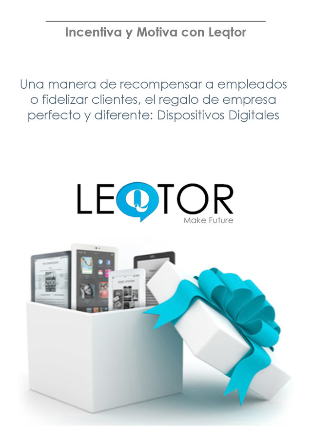 como solución a incentivos/gratificaciones? 1. Excelente Calidad 2. Diferente = Valor Añadido 3. Relación Calidad/Precio Leqtor ofrece las mejores soluciones en dispositivos digitales: eBooks y Tablets. Todos nuestros dispositivos son ligeros y portátiles, y están cuidadosamente diseñados para encajar con la vida personal y profesional. Regalar un jamón o una agenda no esta mal, pero eso lo hacen muchos. Distinga su empresa del resto, apórtele valor e imagen de marca. Regale una Tablet o un Lector de eBooks. Nuestros precios para empresas no tienen competidor, y todos nuestros dispositivos están garantizados. Le sorprenderá saber que podemos ofrecerle una Tablet o Lector eBook desde 40€.